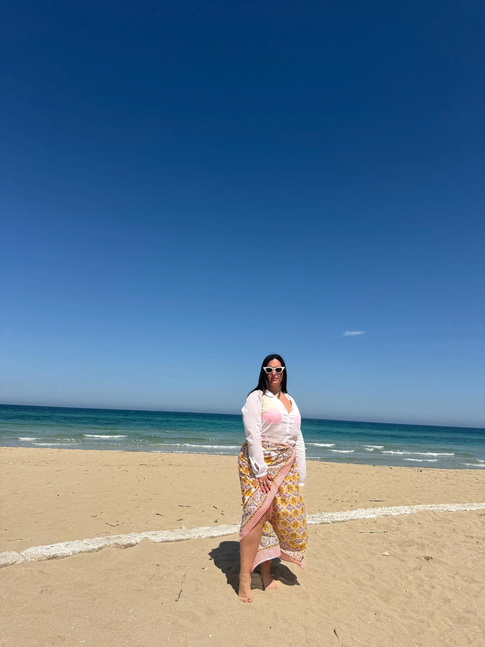 Scopri il nostro meraviglioso pareo sarong in mussola di cotone 100%, realizzato interamente a mano con la tecnica tradizionale della stampa a blocchi su tessuto. Questo accessorio è un vero must-have per l’estate: leggerissimo, traspirante e incredibilmente versatile.