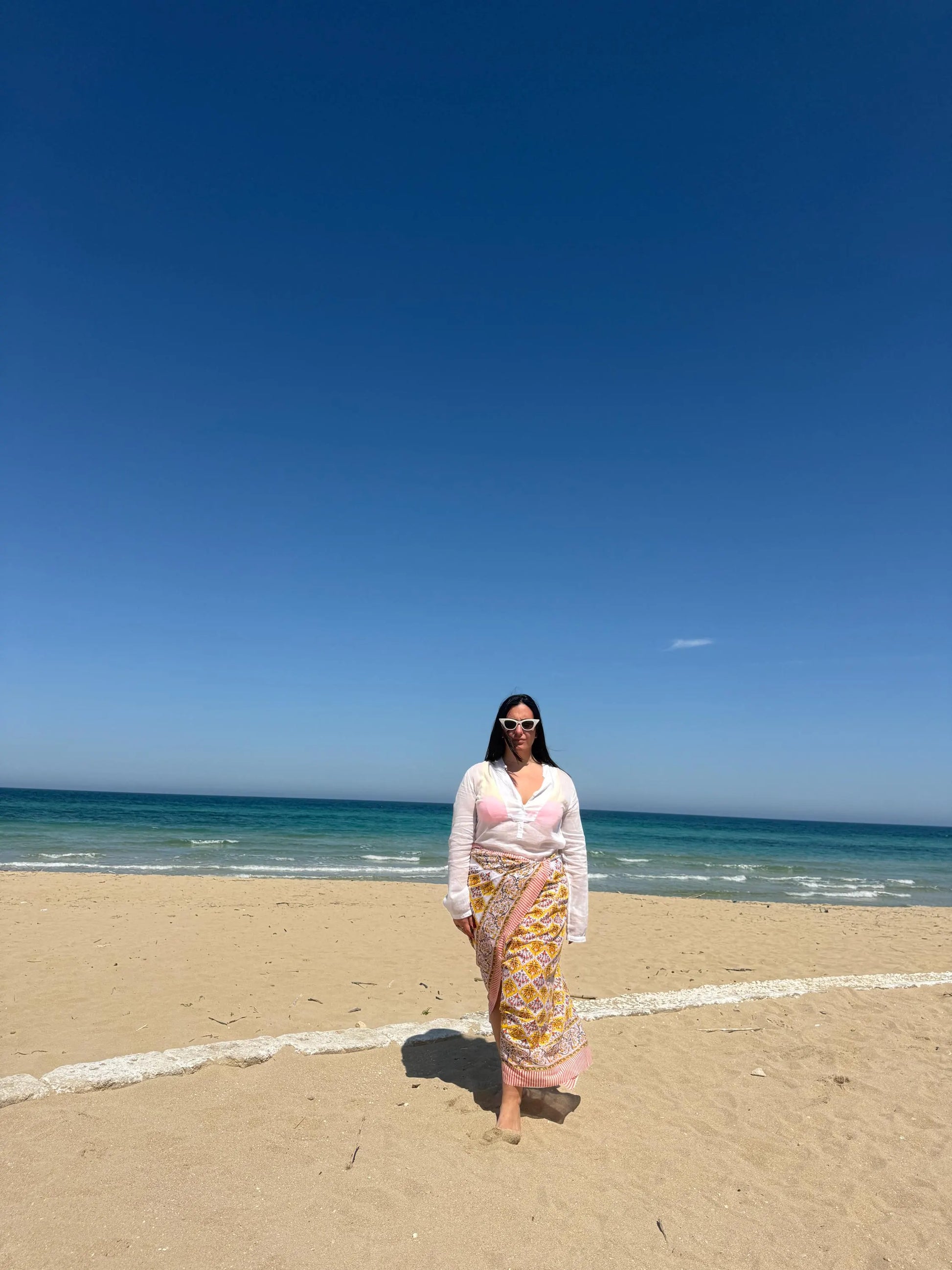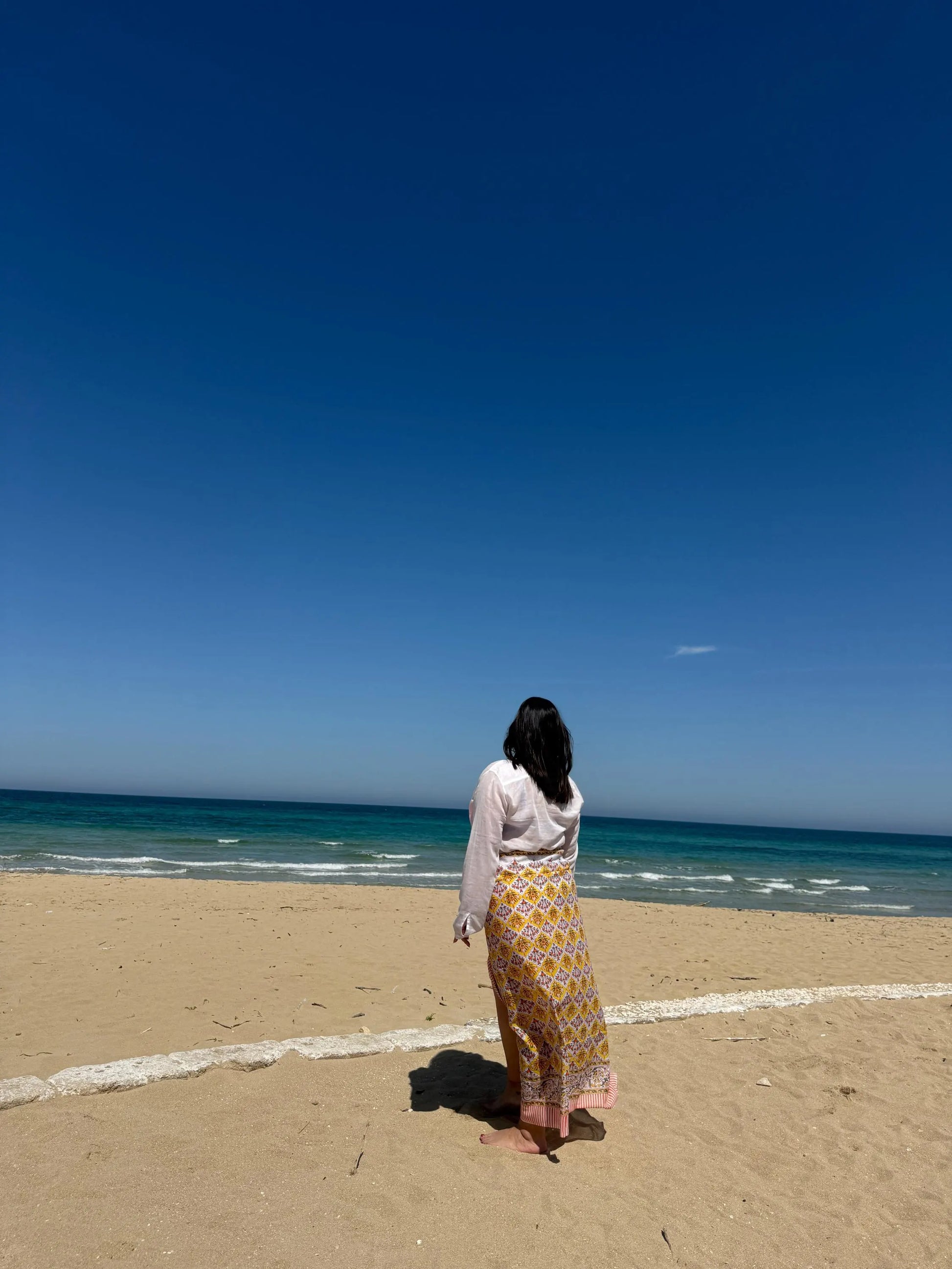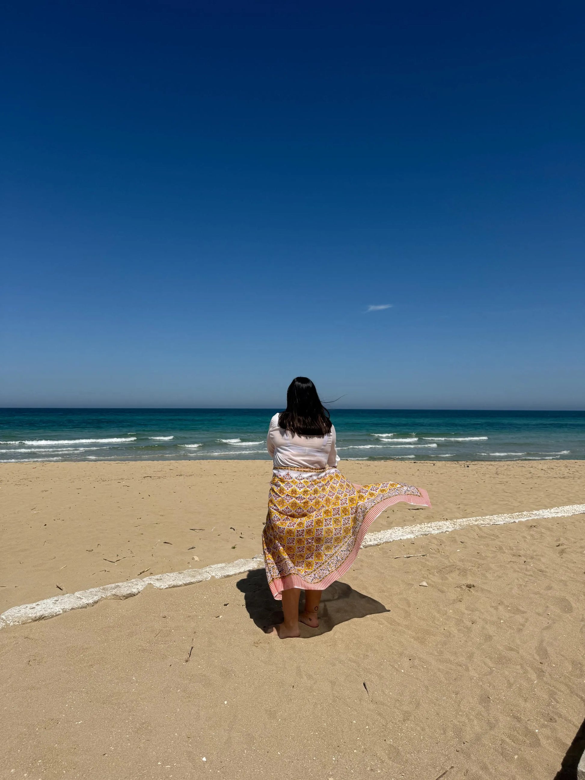 Ogni pareo è unico, stampato a mano con colori naturali su cotone biologico, nel rispetto dell’ambiente e delle tradizioni artigianali.