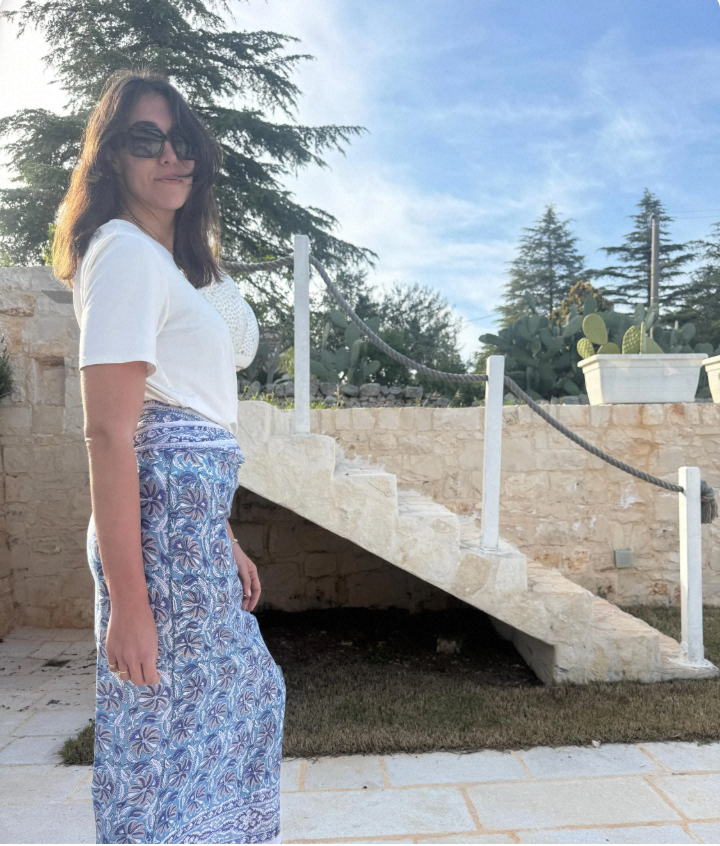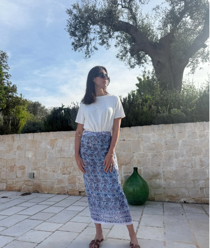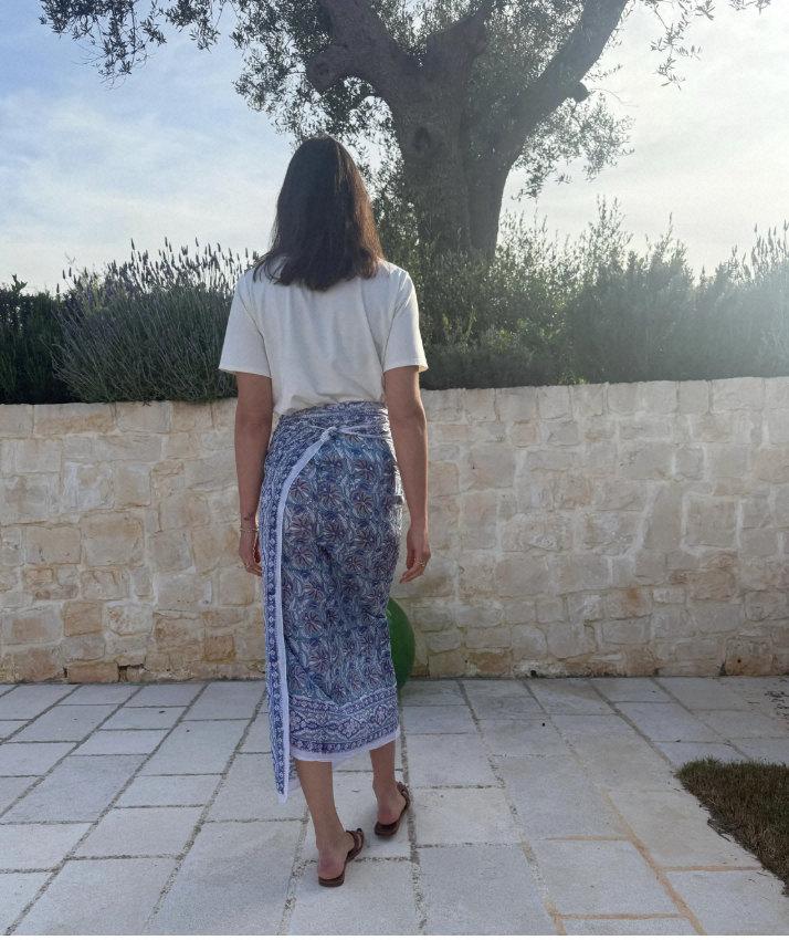 Ogni pareo è unico, stampato a mano con colori naturali su cotone biologico, nel rispetto dell’ambiente e delle tradizioni artigianali.