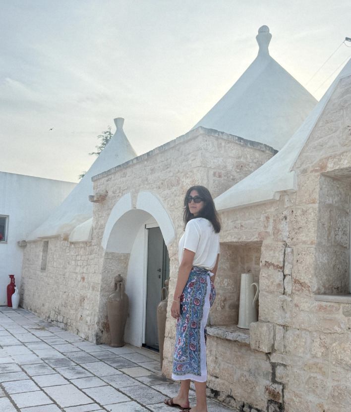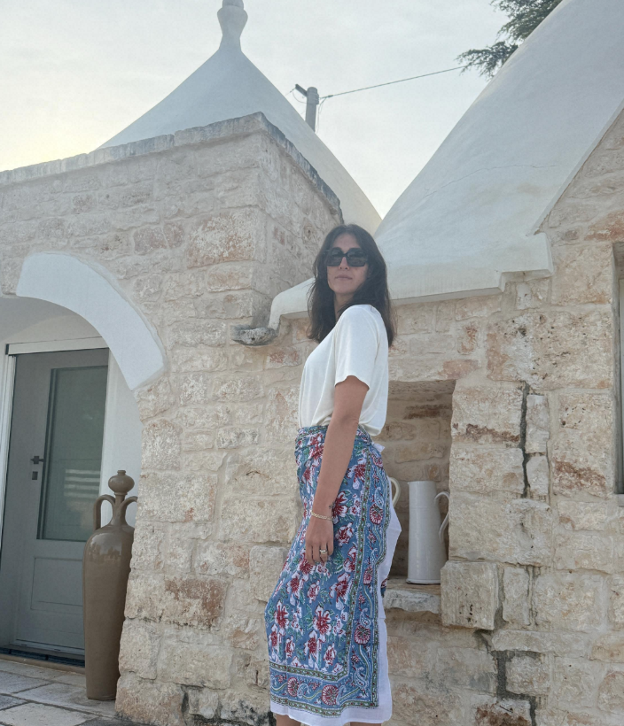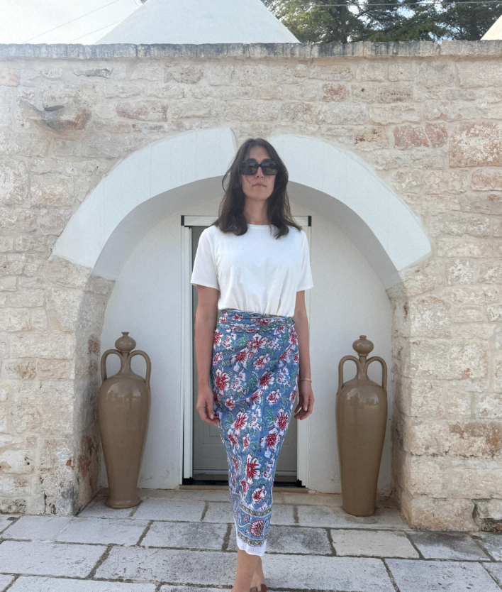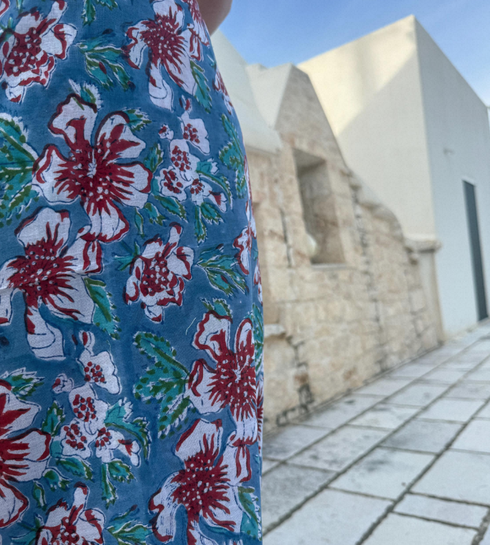Ogni pareo è unico, stampato a mano con colori naturali su cotone biologico, nel rispetto dell’ambiente e delle tradizioni artigianali.