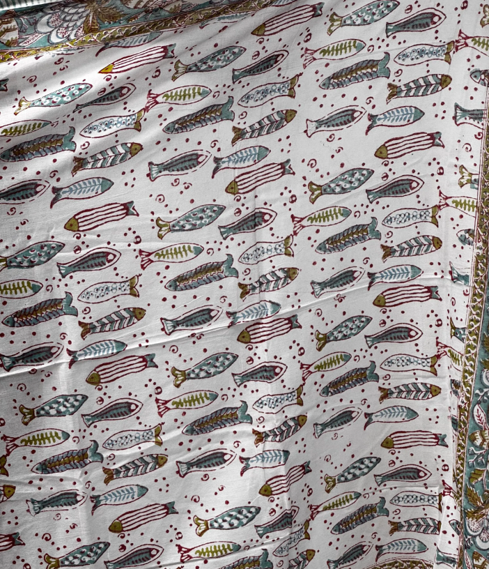 Pareo in mussola di cotone, tessuto stampato a mano. Disegno pesci .A52