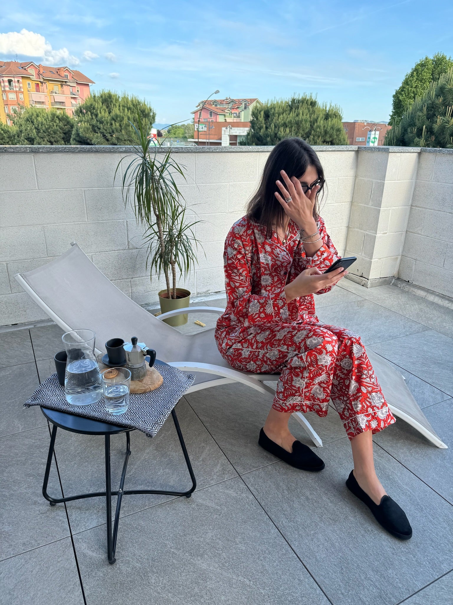 Realizzato interamente a mano dai nostri artigiani a Jaipur, questo pigiama è un omaggio all’eleganza e alla bellezza dell’artigianato autentico. Il tessuto in cotone organico, morbido e leggero, è stampato a mano secondo le tecniche tradizionali, rendendo ogni pezzo unico.
