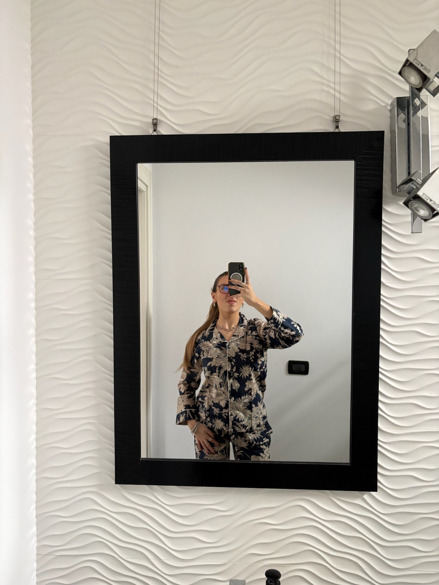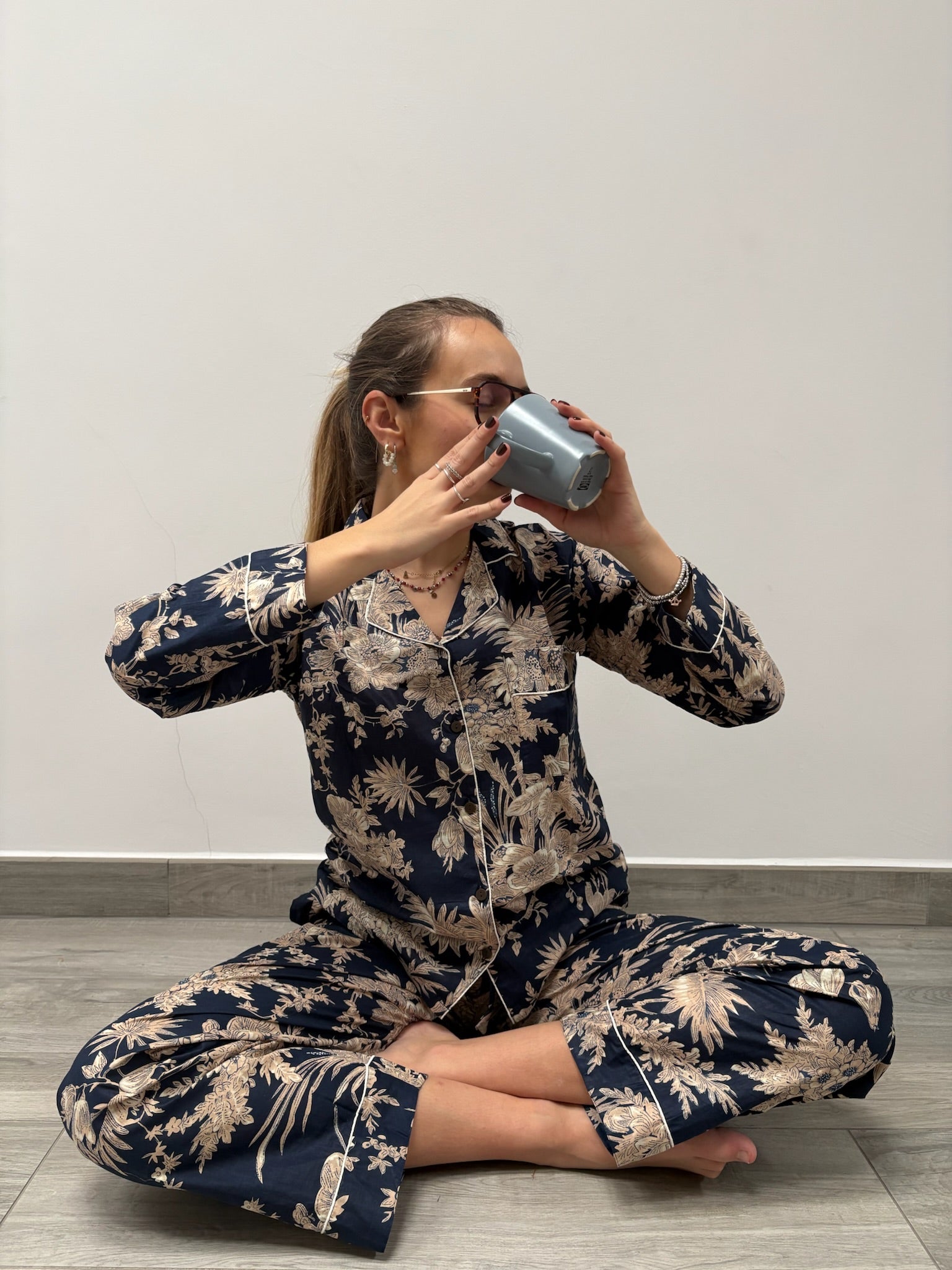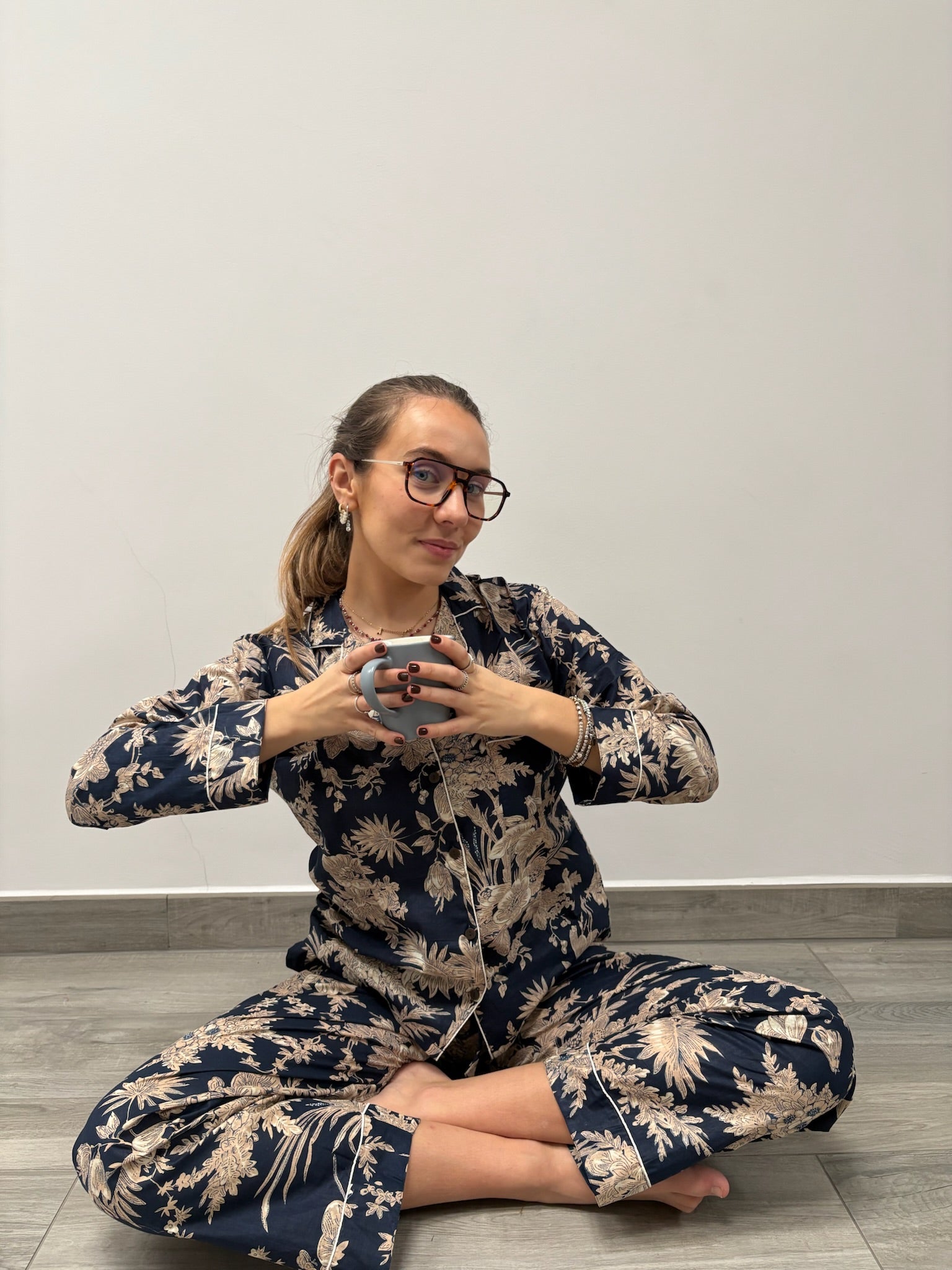 Il set è composto da una camicia a maniche lunghe con bottoni e pantaloni dalla vestibilità ampia, pensati per offrire il massimo comfort in ogni stagione. È l’alleato perfetto da portare in viaggio, da indossare a casa, o per vivere con stile momenti speciali – dai servizi fotografici ai ricordi più intimi.
