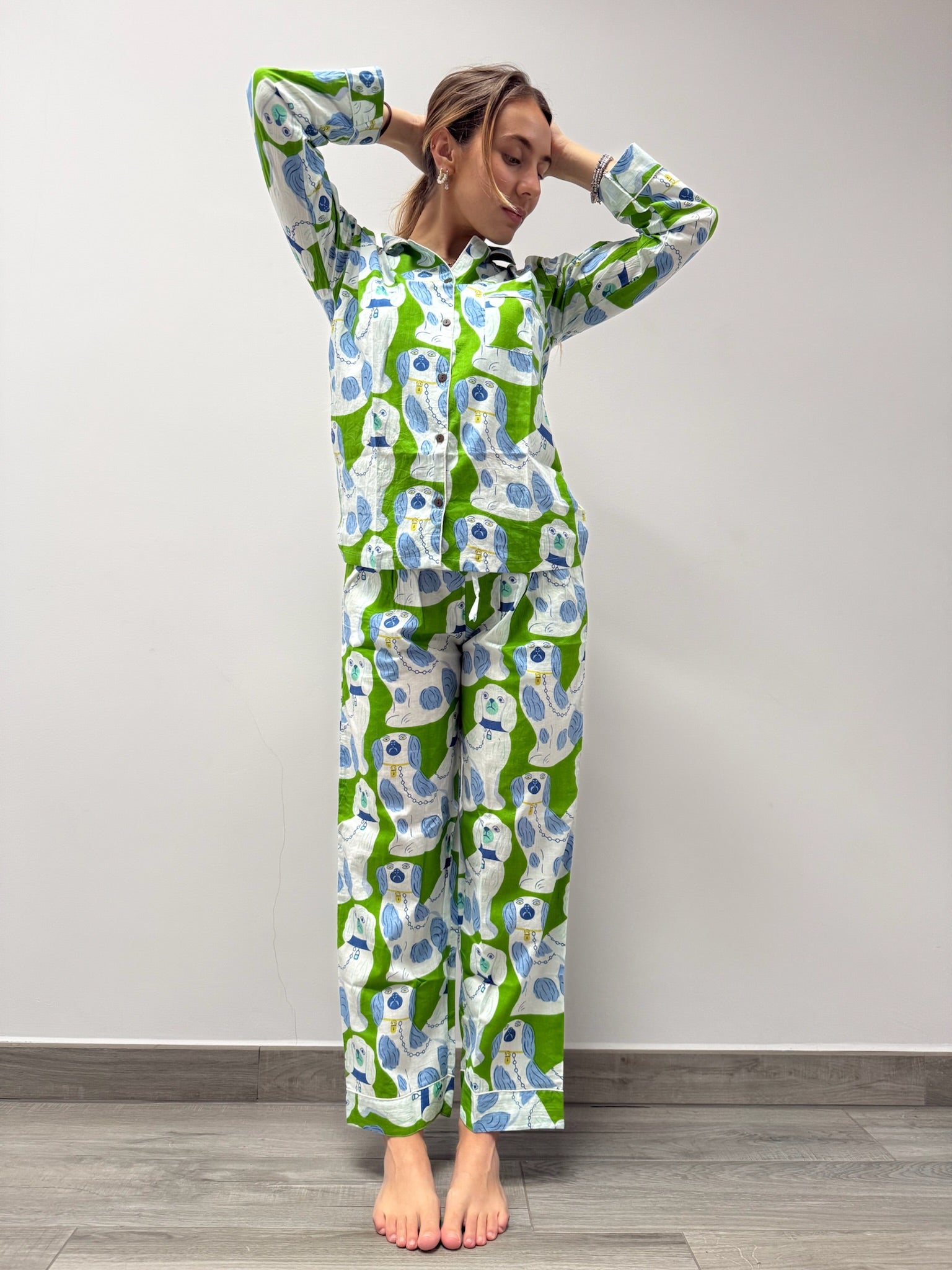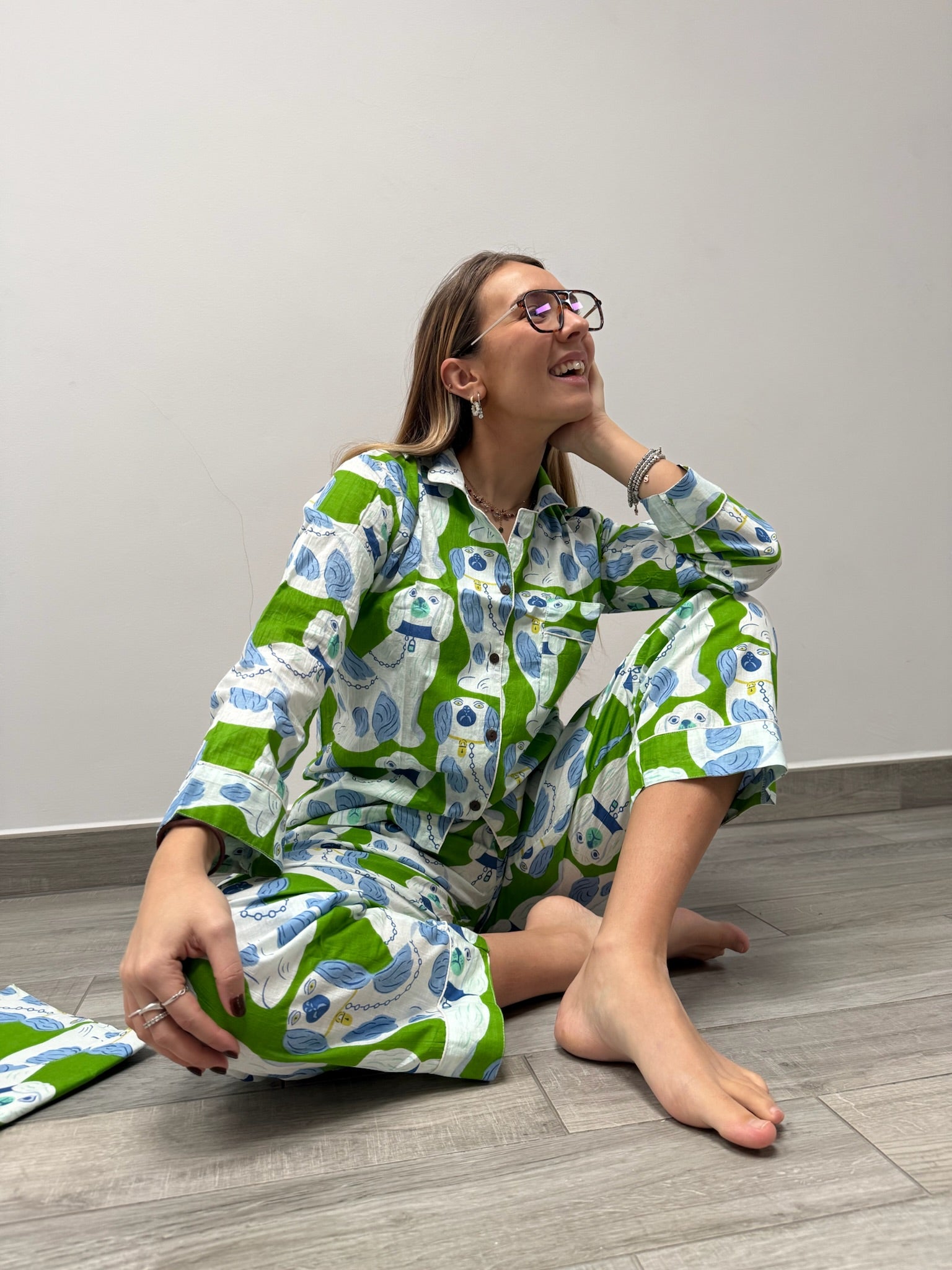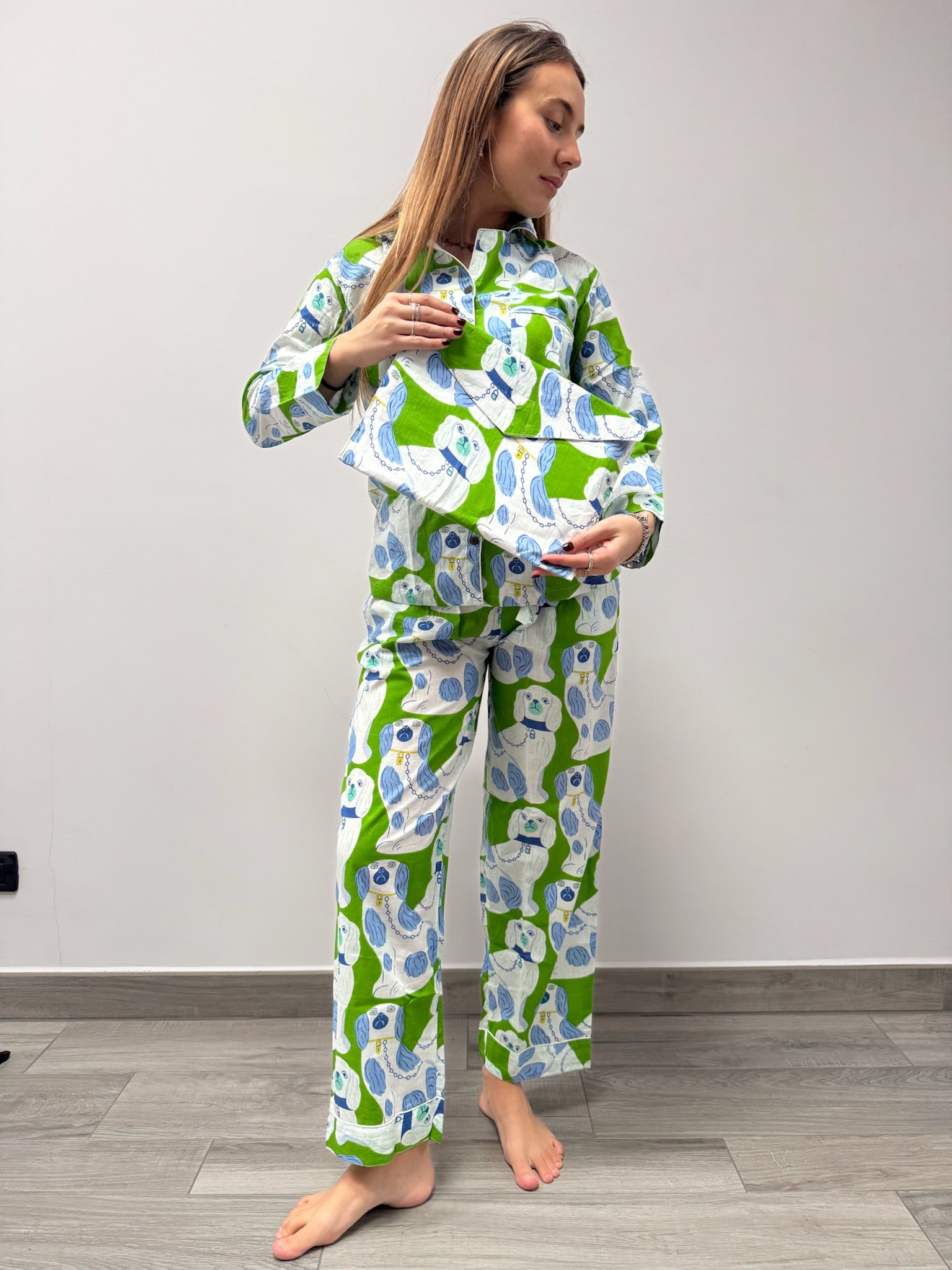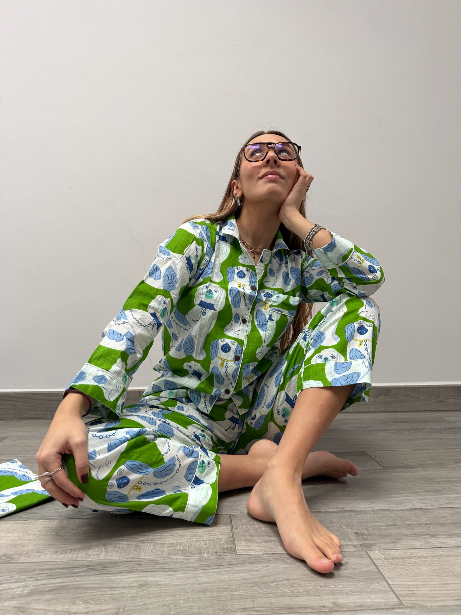 Il set è composto da una camicia a maniche lunghe con bottoni e pantaloni dalla vestibilità ampia, pensati per offrire il massimo comfort in ogni stagione. È l’alleato perfetto da portare in viaggio, da indossare a casa, o per vivere con stile momenti speciali – dai servizi fotografici ai ricordi più intimi.