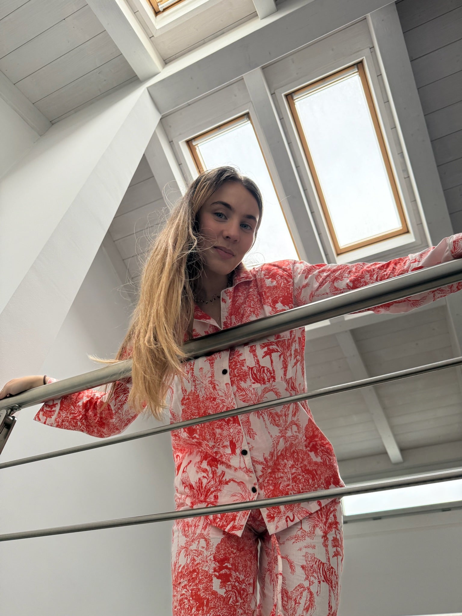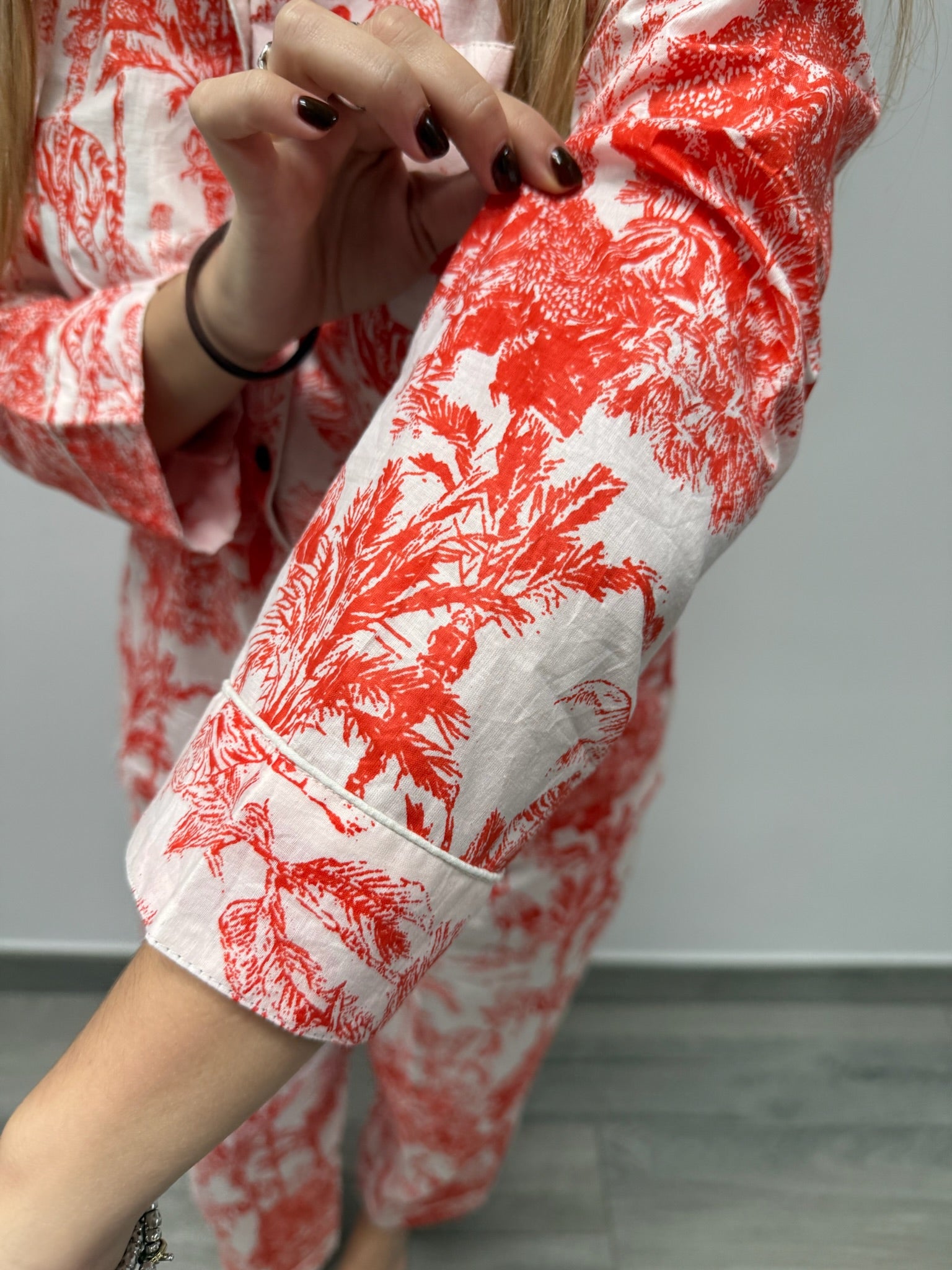 Il set è composto da una camicia a maniche lunghe con bottoni e pantaloni dalla vestibilità ampia, pensati per offrire il massimo comfort in ogni stagione. È l’alleato perfetto da portare in viaggio, da indossare a casa, o per vivere con stile momenti speciali – dai servizi fotografici ai ricordi più intimi.