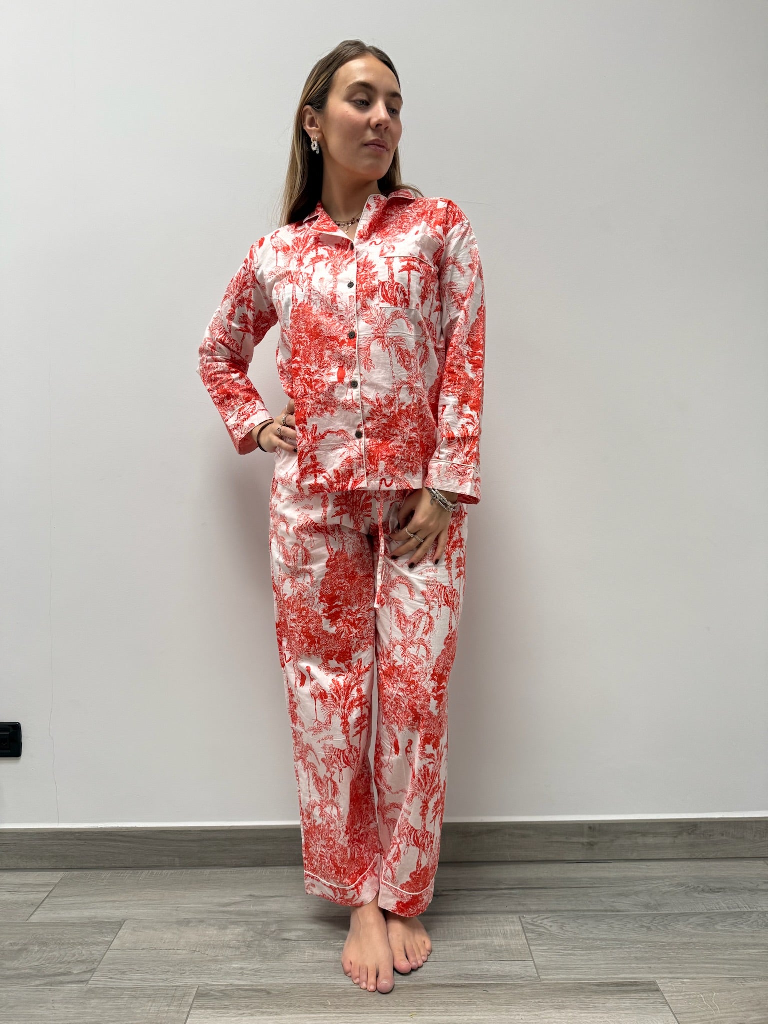 aRealizzato interamente a mano dai nostri artigiani a Jaipur, questo pigiama è un omaggio all’eleganza e alla bellezza dell’artigianato autentico. Il tessuto in cotone organico, morbido e leggero, è stampato a mano secondo le tecniche tradizionali, rendendo ogni pezzo unico.