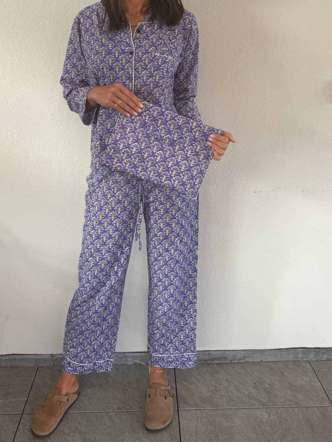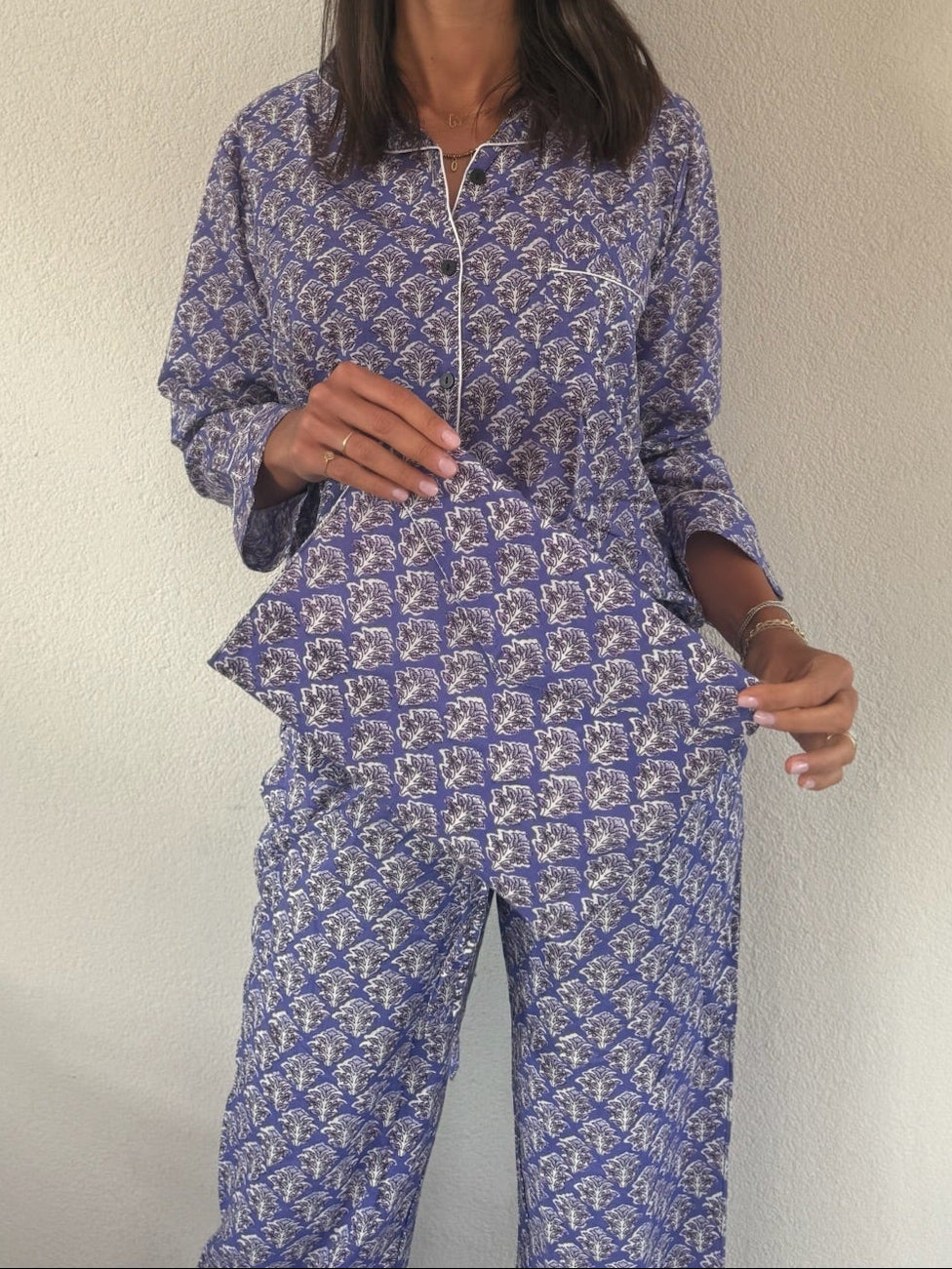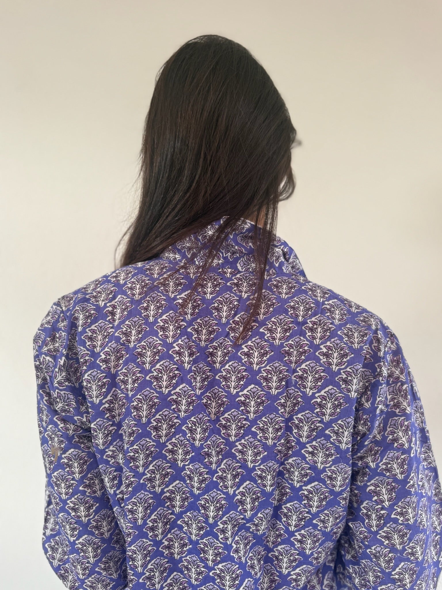 Realizzato interamente a mano dai nostri artigiani a Jaipur, questo pigiama è un omaggio all’eleganza e alla bellezza dell’artigianato autentico. Il tessuto in cotone organico, morbido e leggero, è stampato a mano secondo le tecniche tradizionali, rendendo ogni pezzo unico.