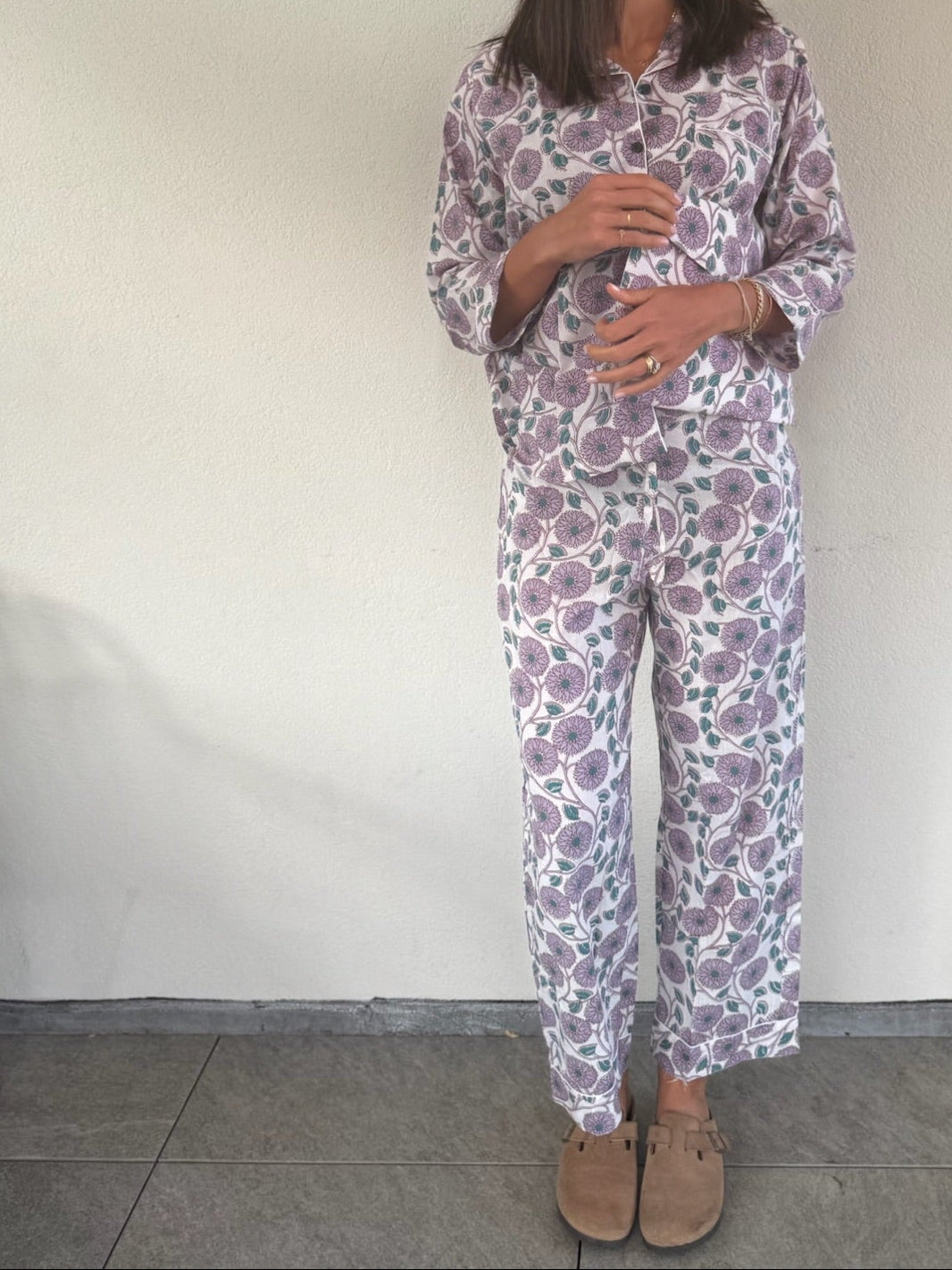 Il set è composto da una camicia a maniche lunghe con bottoni e pantaloni dalla vestibilità ampia, pensati per offrire il massimo comfort in ogni stagione. È l’alleato perfetto da portare in viaggio, da indossare a casa, o per vivere con stile momenti speciali – dai servizi fotografici ai ricordi più intimi.