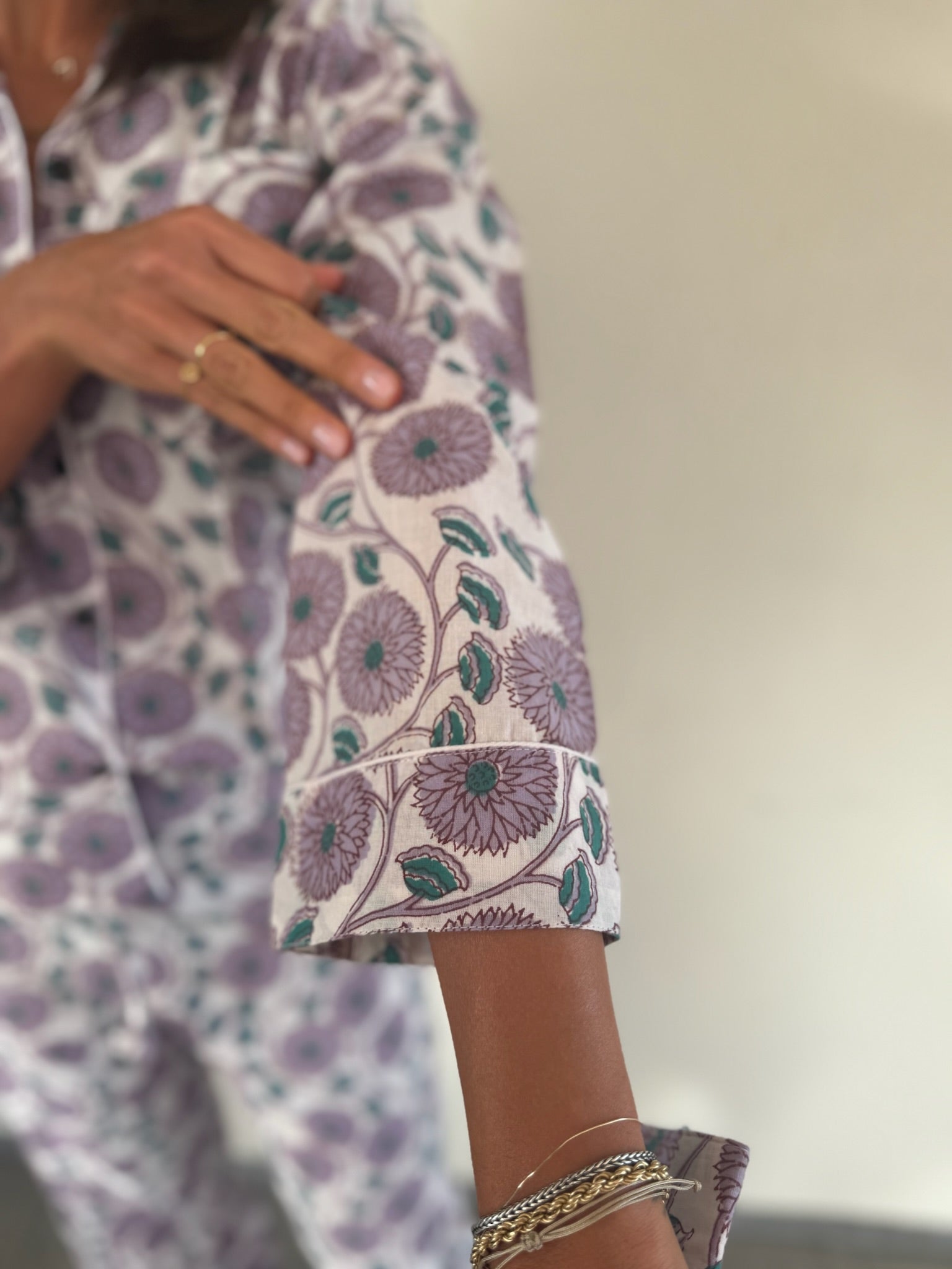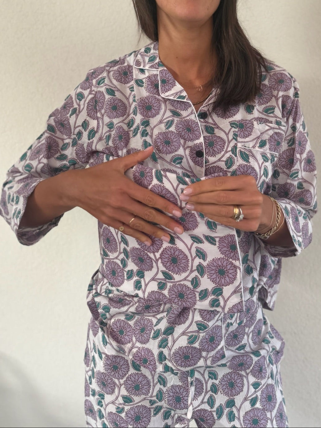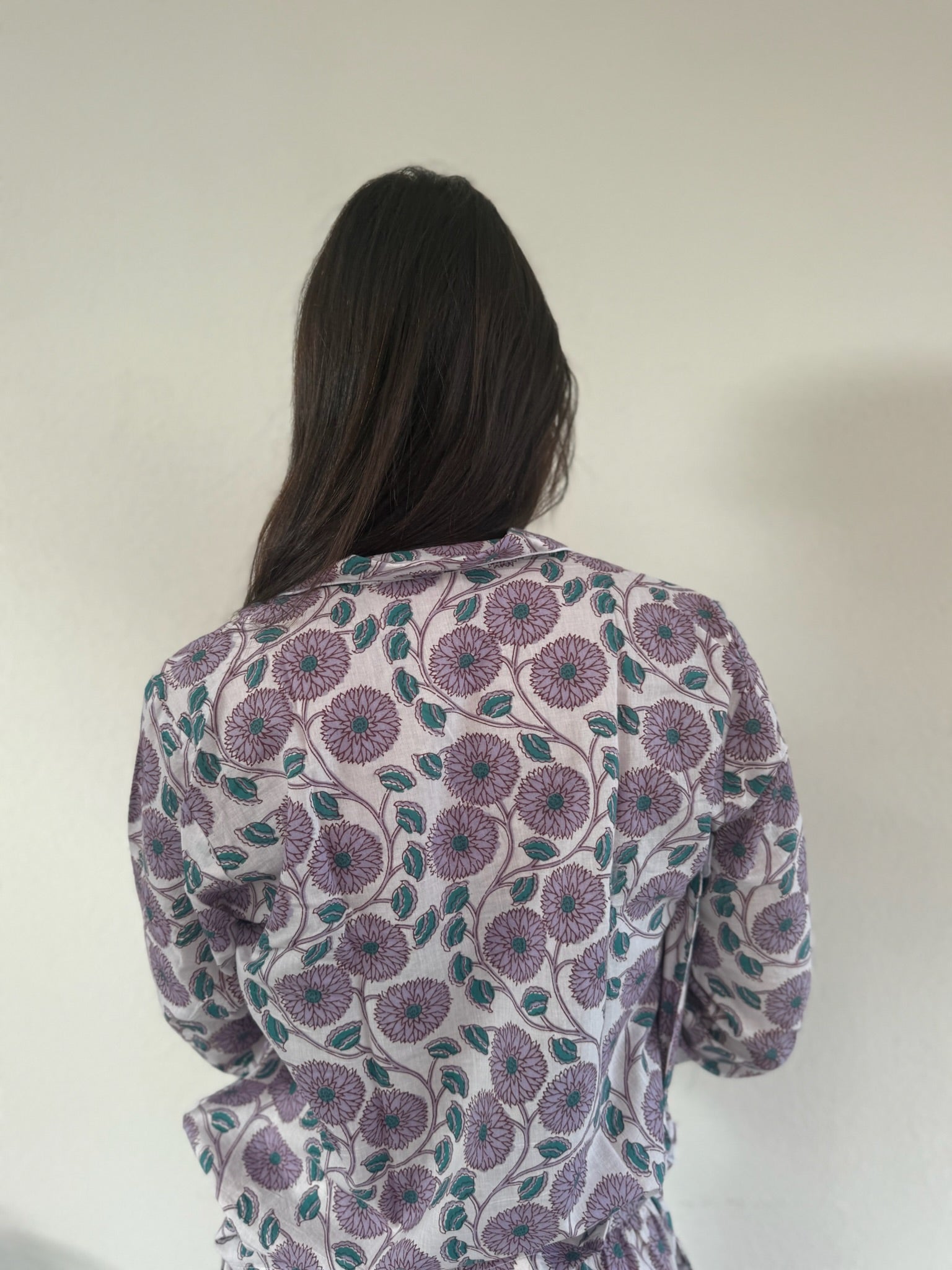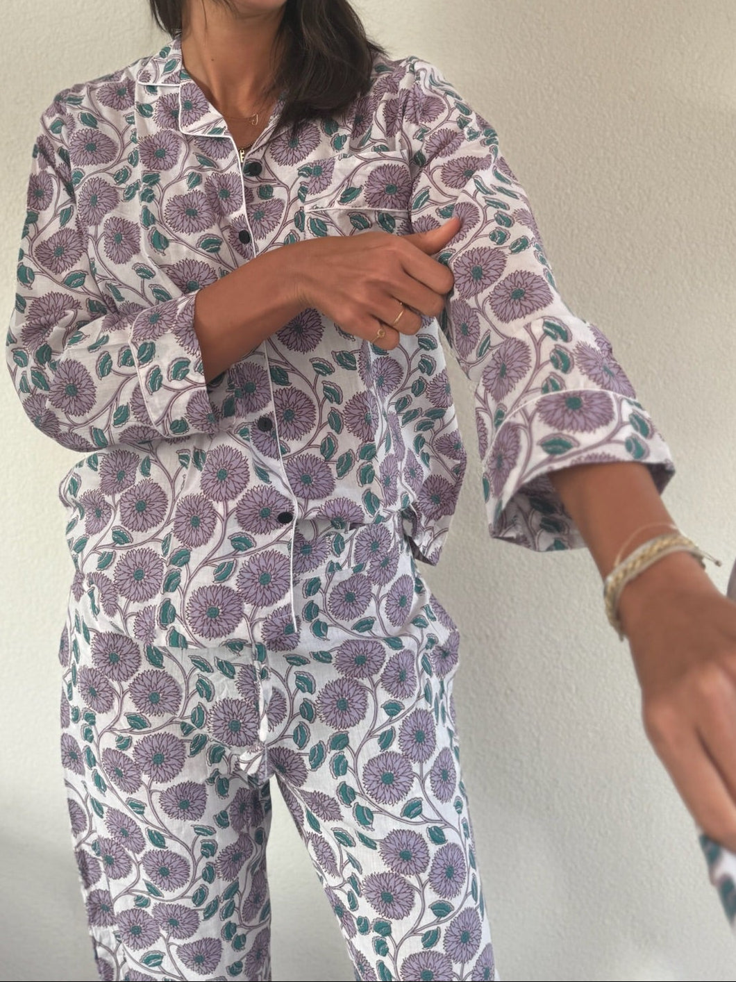 Realizzato interamente a mano dai nostri artigiani a Jaipur, questo pigiama è un omaggio all’eleganza e alla bellezza dell’artigianato autentico. Il tessuto in cotone organico, morbido e leggero, è stampato a mano secondo le tecniche tradizionali, rendendo ogni pezzo unico.