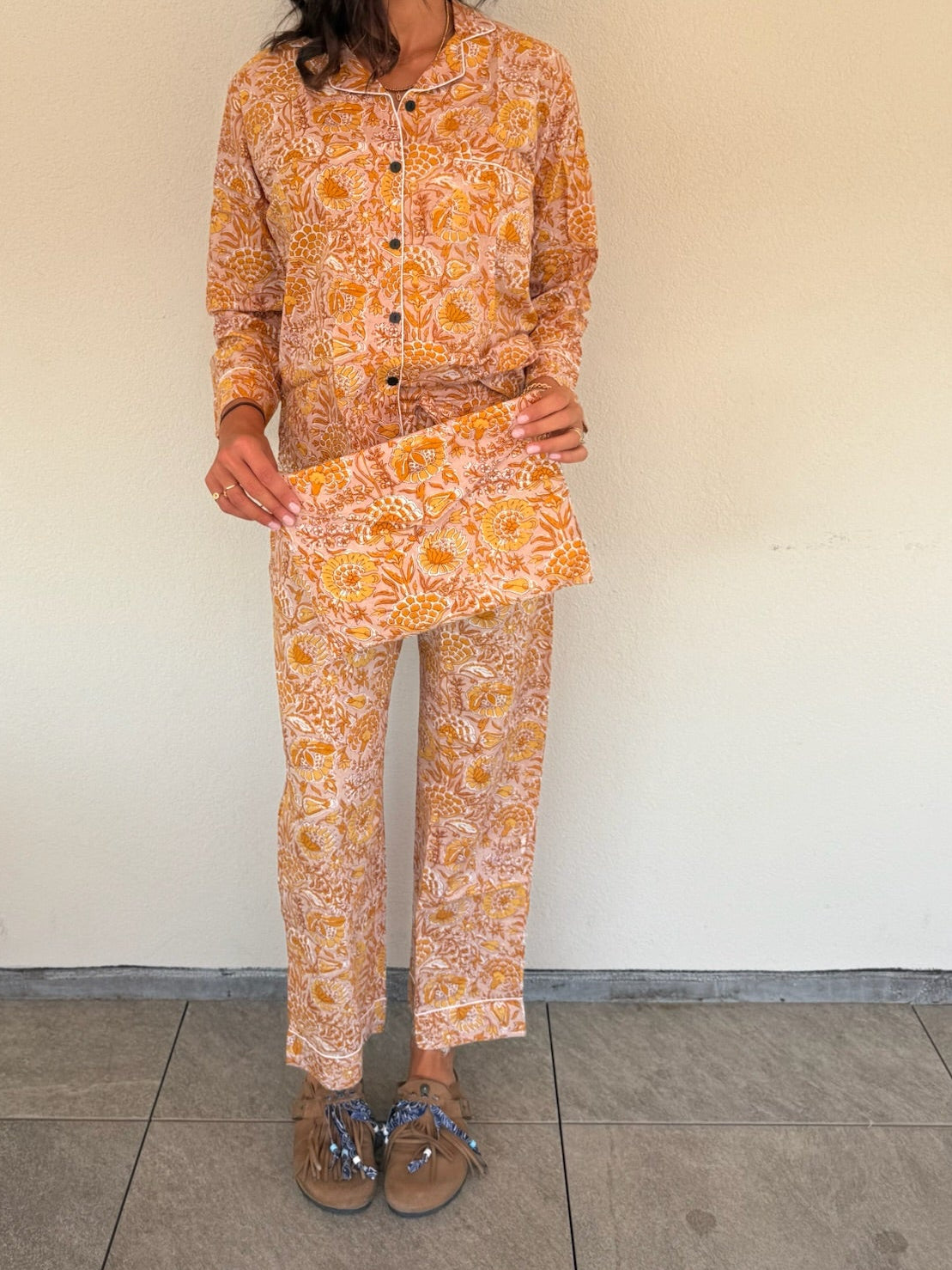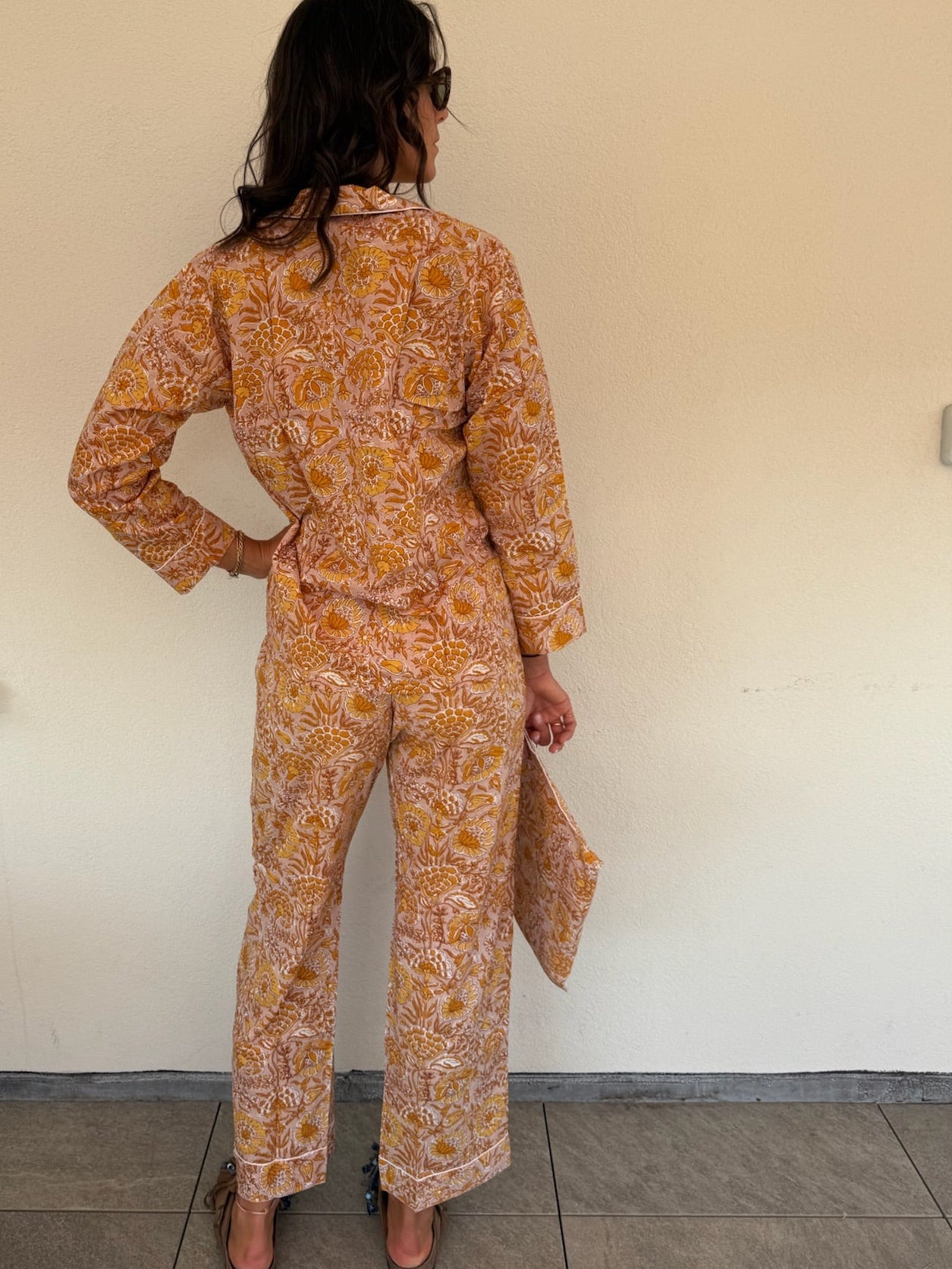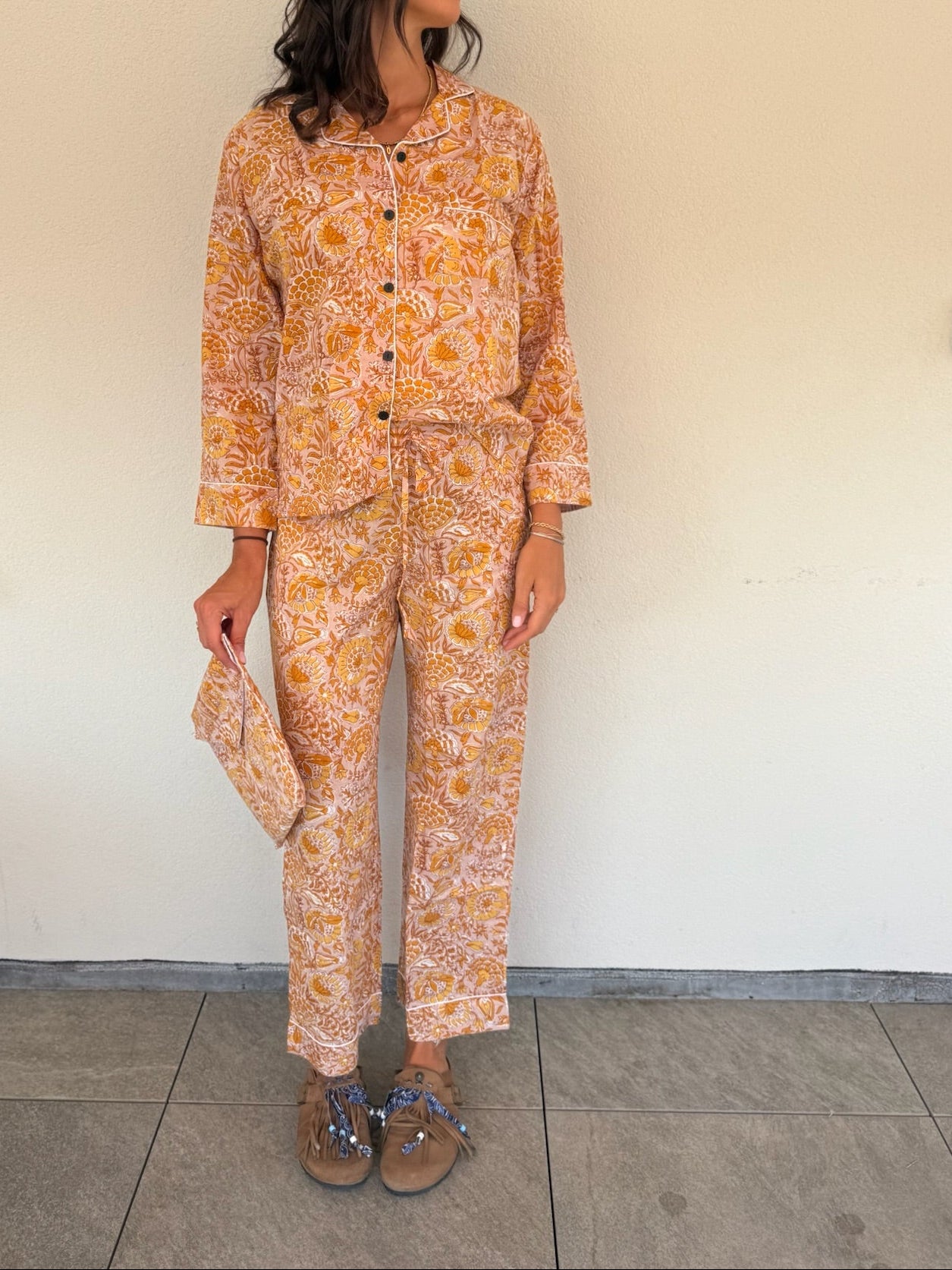 Realizzato interamente a mano dai nostri artigiani a Jaipur, questo pigiama è un omaggio all’eleganza e alla bellezza dell’artigianato autentico. Il tessuto in cotone organico, morbido e leggero, è stampato a mano secondo le tecniche tradizionali, rendendo ogni pezzo unico.