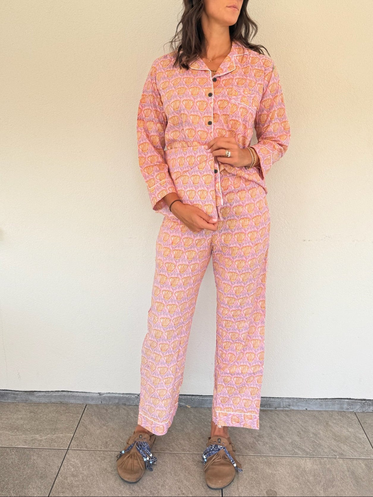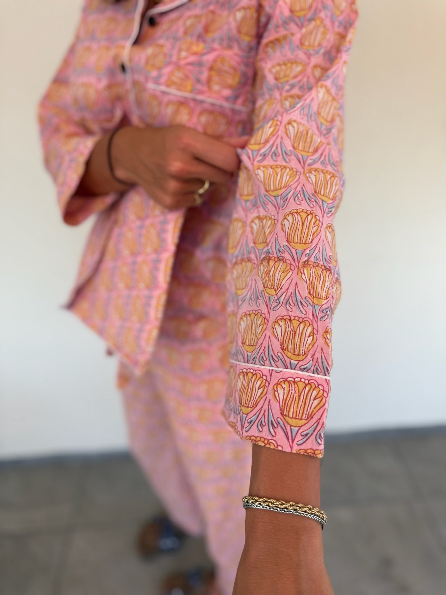 Realizzato interamente a mano dai nostri artigiani a Jaipur, questo pigiama è un omaggio all’eleganza e alla bellezza dell’artigianato autentico. Il tessuto in cotone organico, morbido e leggero, è stampato a mano secondo le tecniche tradizionali, rendendo ogni pezzo unico.
