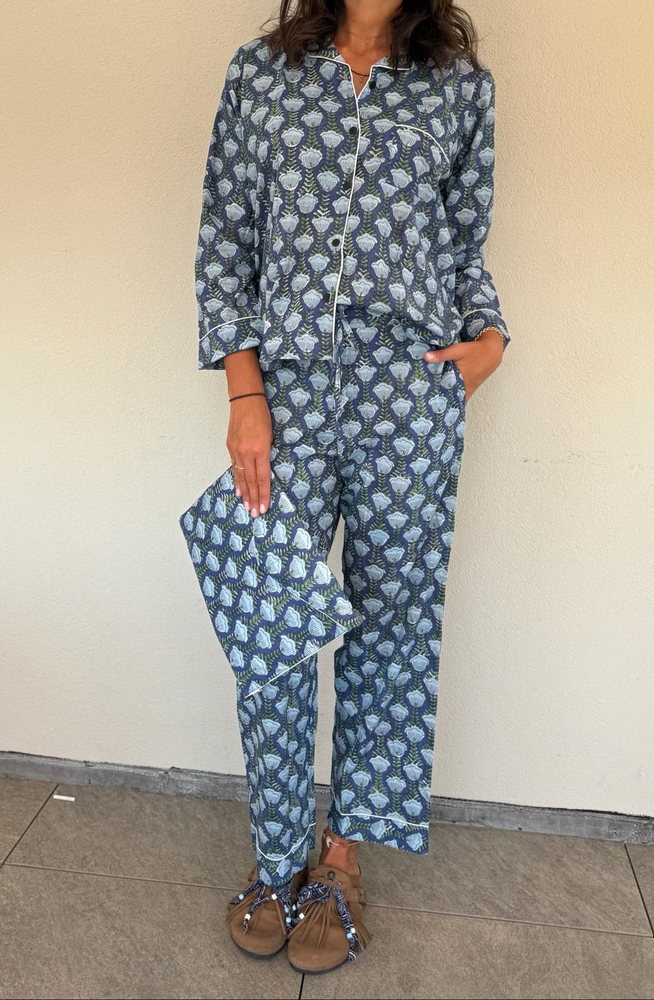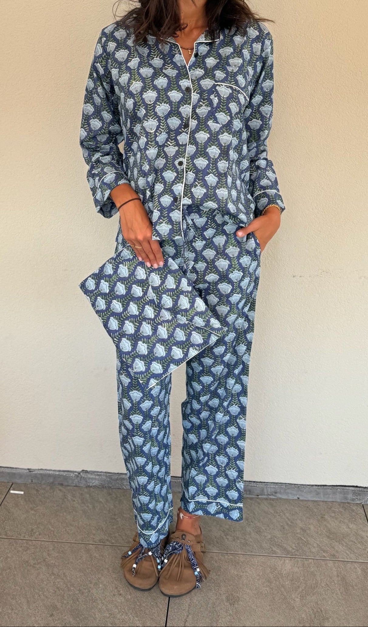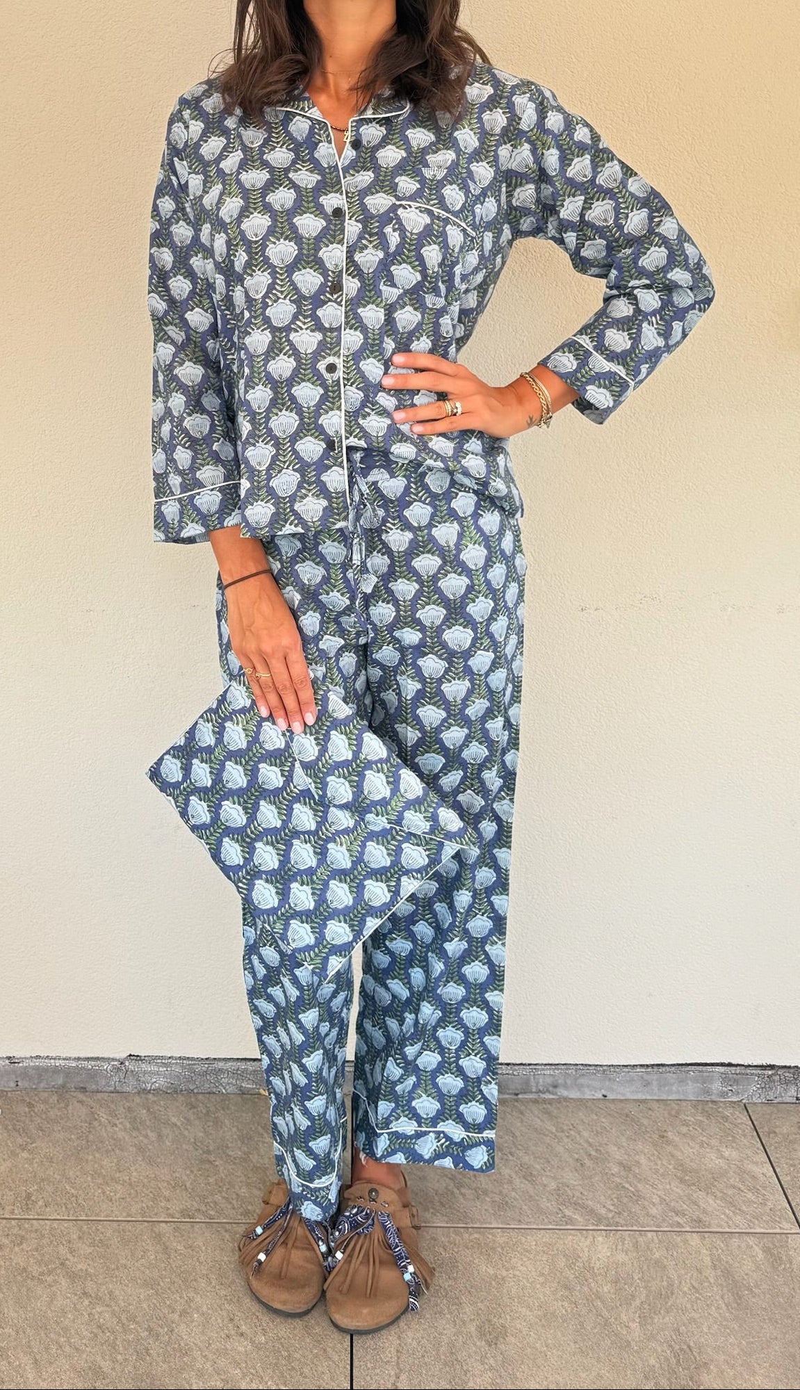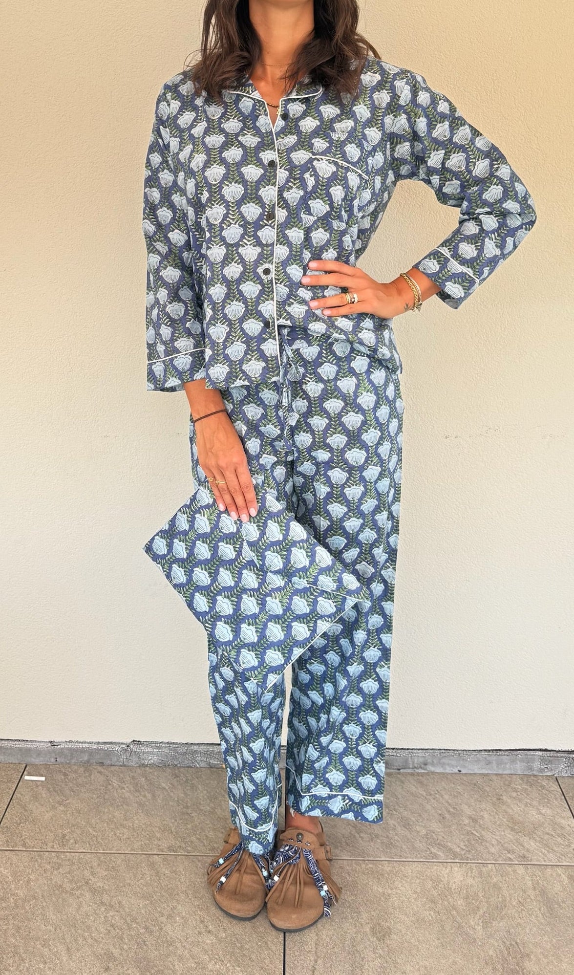 Realizzato interamente a mano dai nostri artigiani a Jaipur, questo pigiama è un omaggio all’eleganza e alla bellezza dell’artigianato autentico. Il tessuto in cotone organico, morbido e leggero, è stampato a mano secondo le tecniche tradizionali, rendendo ogni pezzo unico.
