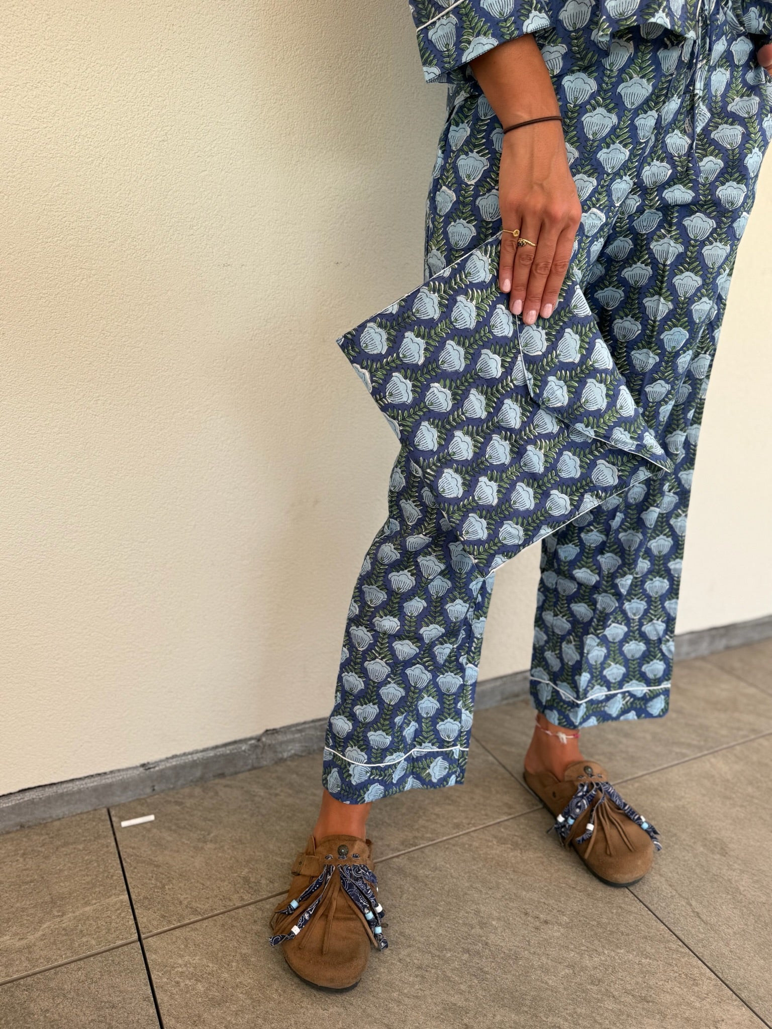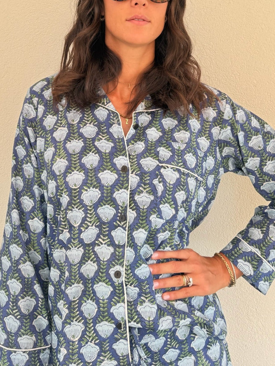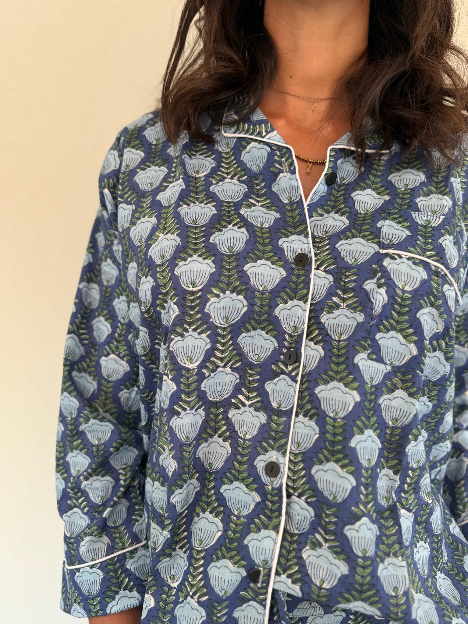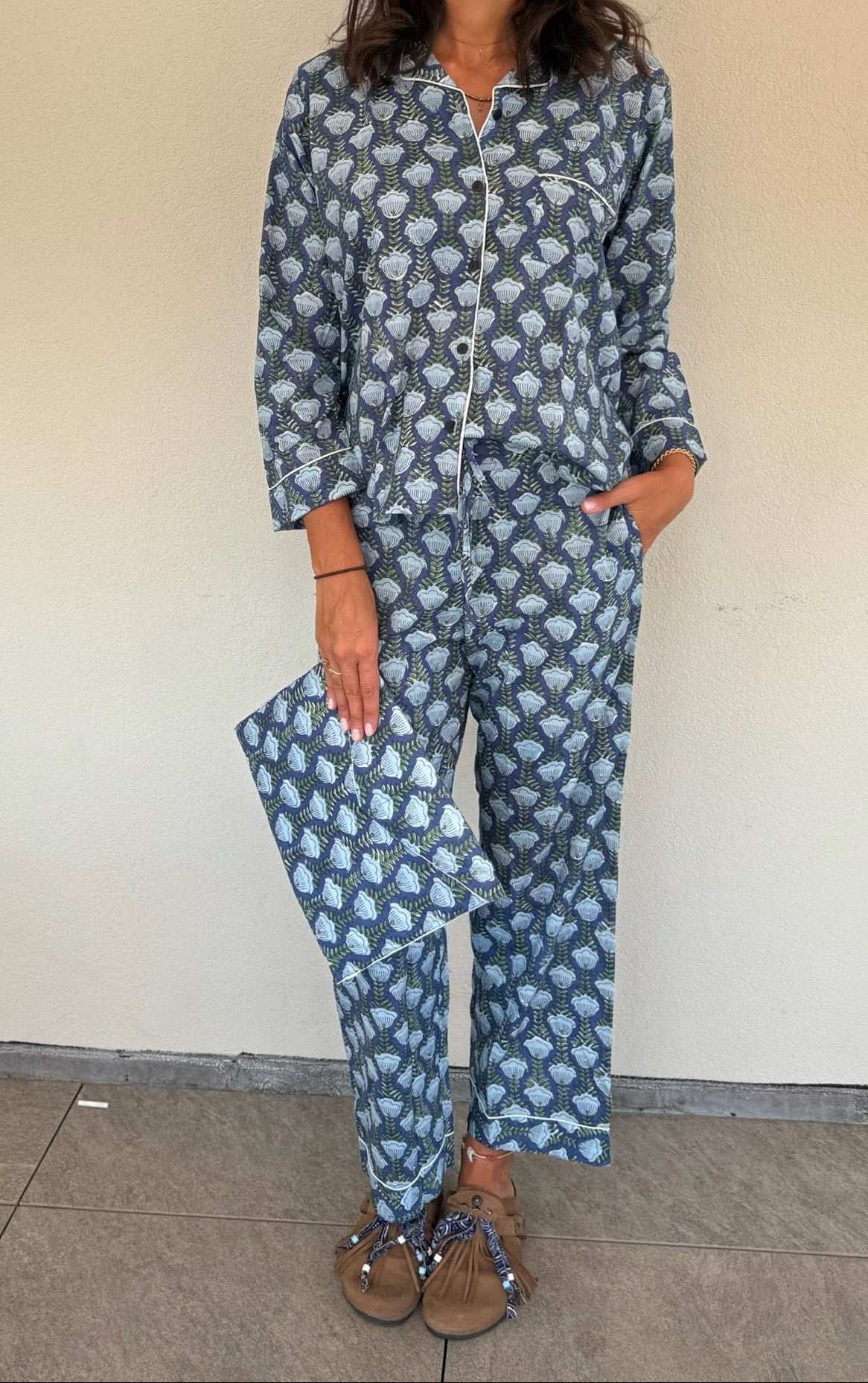Realizzato interamente a mano dai nostri artigiani a Jaipur, questo pigiama è un omaggio all’eleganza e alla bellezza dell’artigianato autentico. Il tessuto in cotone organico, morbido e leggero, è stampato a mano secondo le tecniche tradizionali, rendendo ogni pezzo unico.