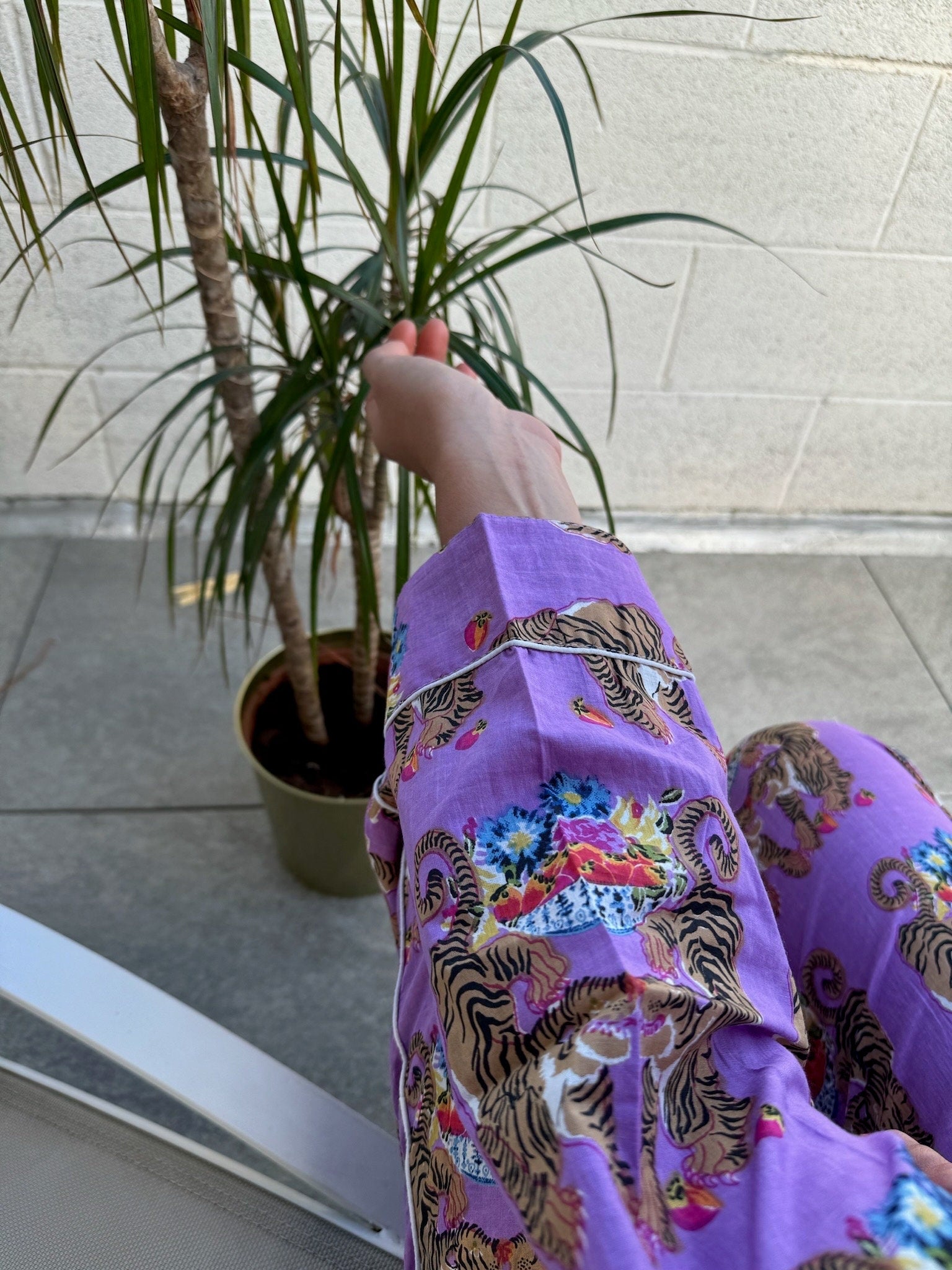 Il set è composto da una camicia a maniche lunghe con bottoni e pantaloni dalla vestibilità ampia, pensati per offrire il massimo comfort in ogni stagione. È l’alleato perfetto da portare in viaggio, da indossare a casa, o per vivere con stile momenti speciali – dai servizi fotografici ai ricordi più intimi.