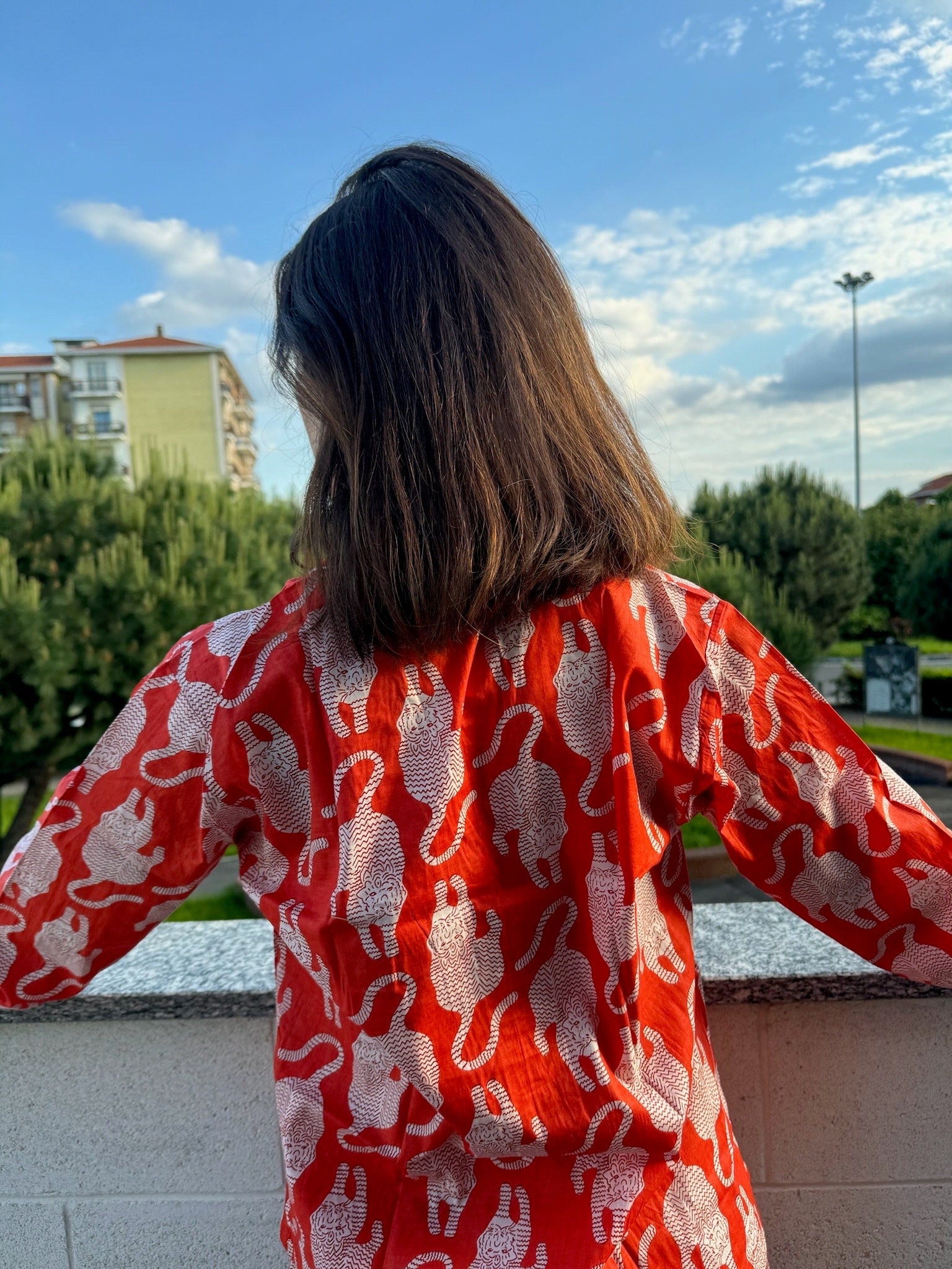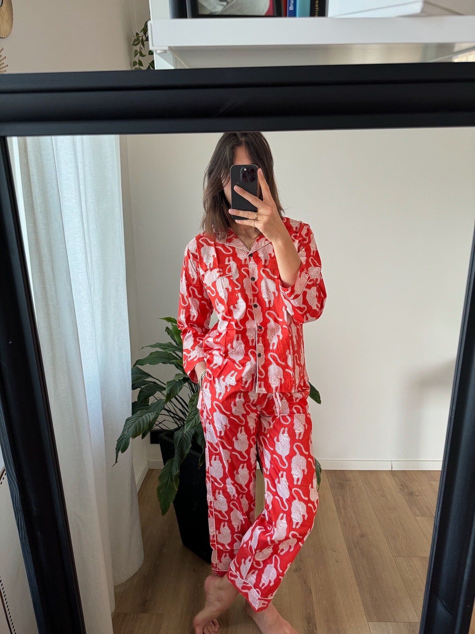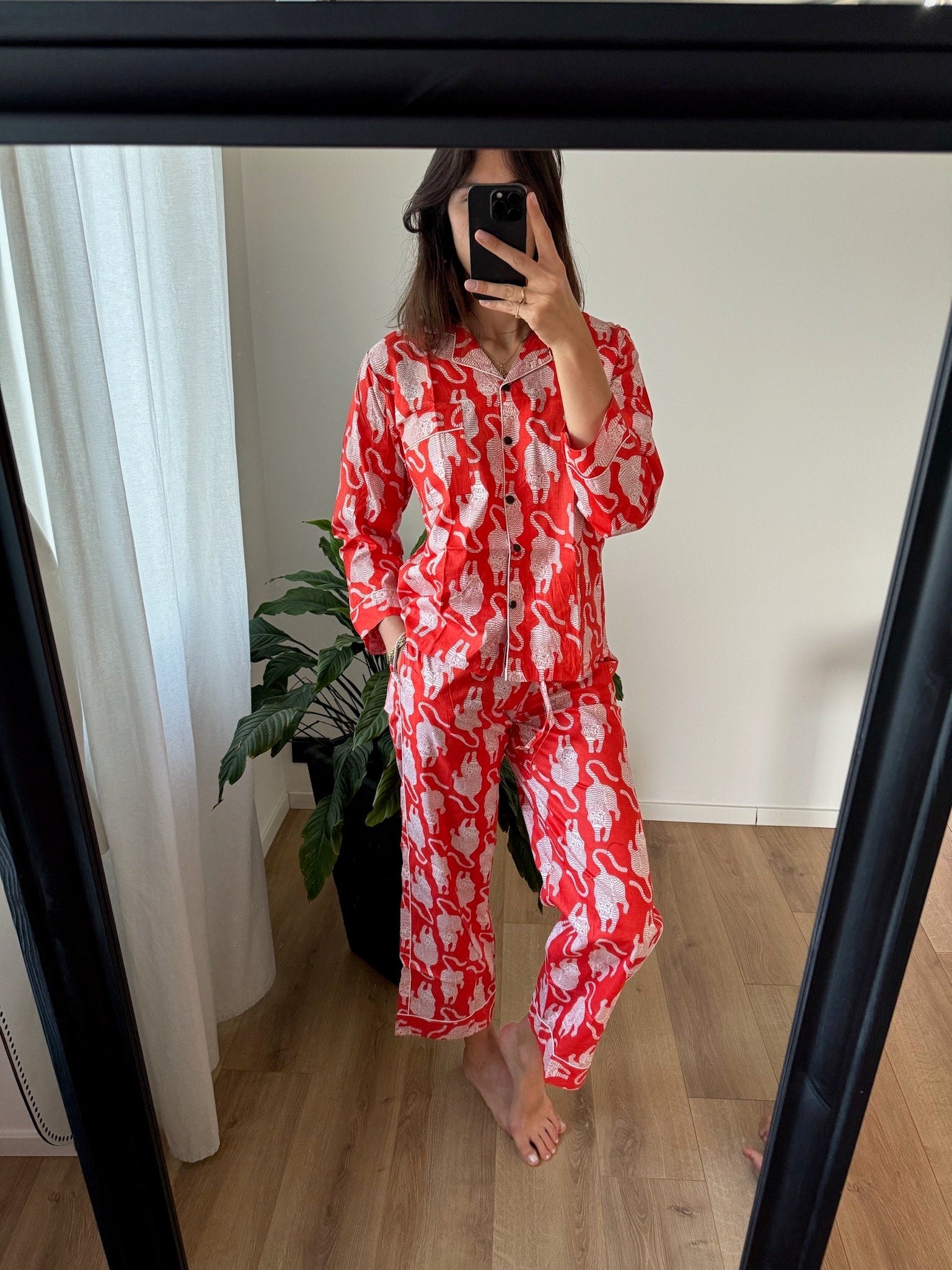Realizzato interamente a mano dai nostri artigiani a Jaipur, questo pigiama è un omaggio all’eleganza e alla bellezza dell’artigianato autentico. Il tessuto in cotone organico, morbido e leggero, è stampato a mano secondo le tecniche tradizionali, rendendo ogni pezzo unico.